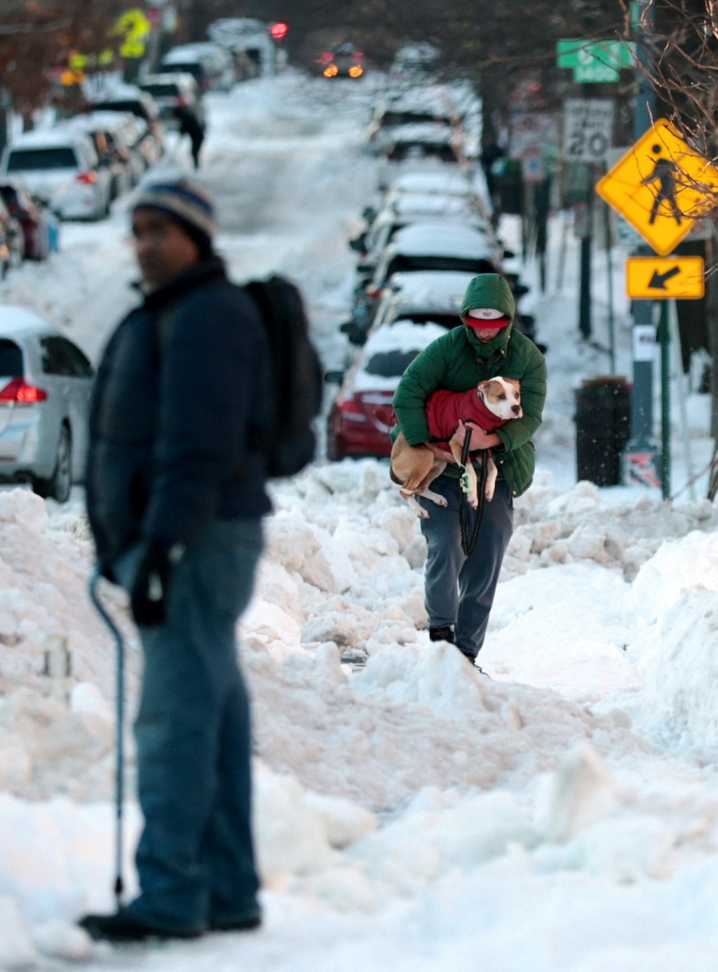 1月27日,在美国首都华盛顿,一名男子抱着宠物狗走在积雪的街头。