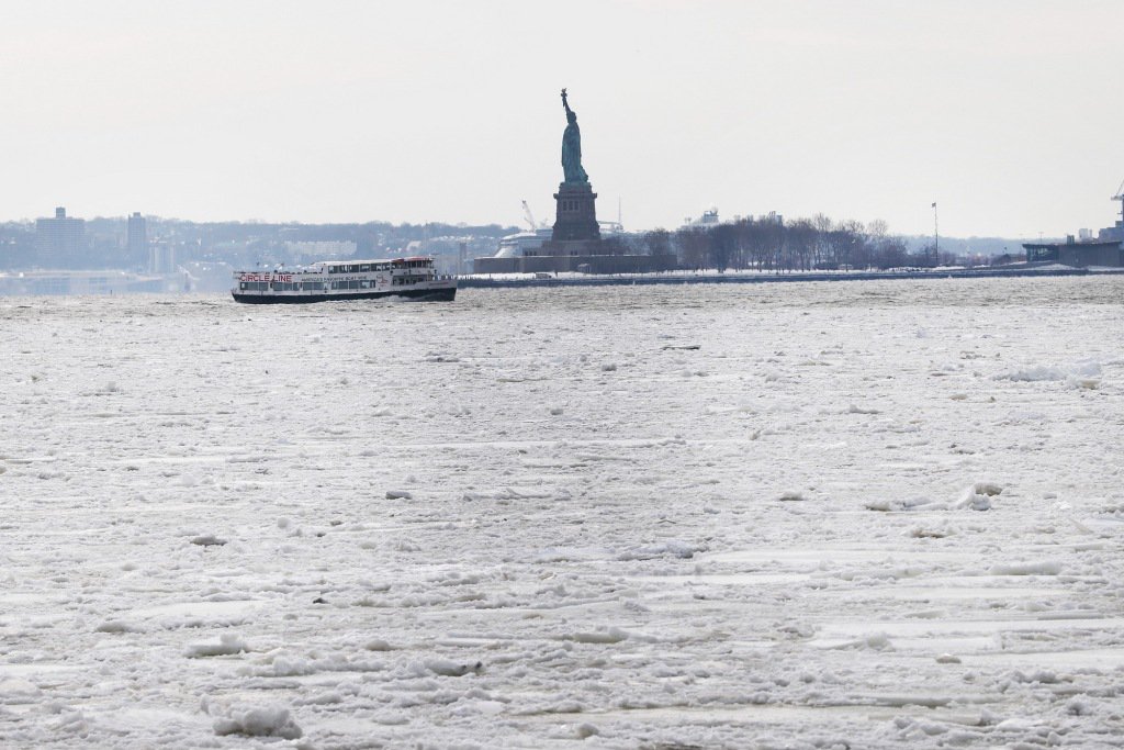 1月27日,美国纽约,哈德逊河上漂浮着冰块,自由女神像矗立在远处。