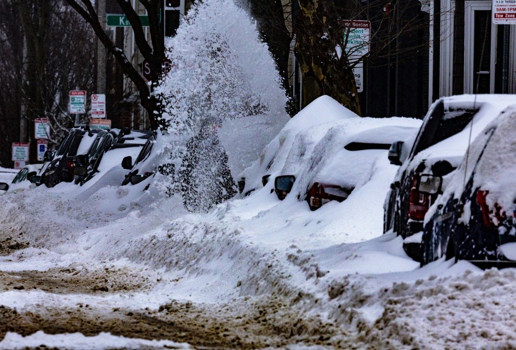 1月26日,美国波士顿,一名男子正在清理被积雪覆盖的汽车。