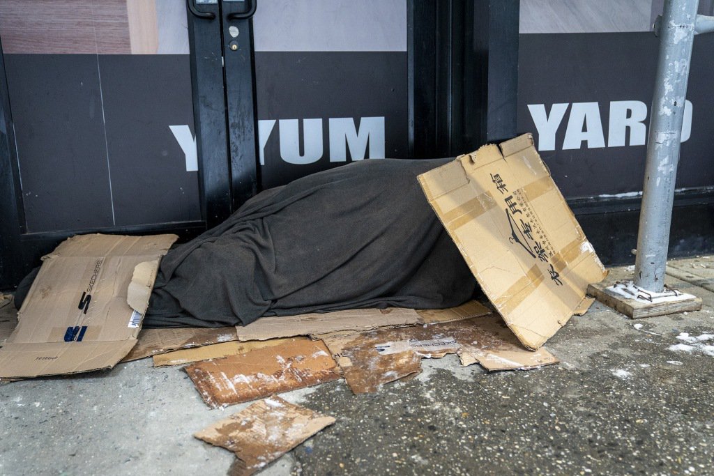 1月26日,美国纽约曼哈顿区,一名流浪者睡在人行道上。