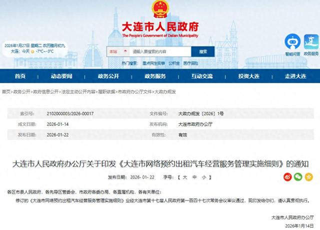 第三十一条本实施细则自2026年2月15日起施行。《大连市人民政府办公厅关于印发大连市网络预约出租汽车经营服务管理实施细则的通知》(大政办发〔2016〕187号)同时废止。