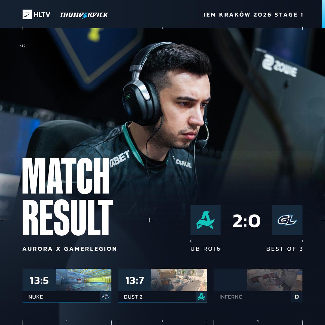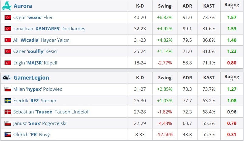 两队上一次交手,Aurora在月初的BLAST赏金赛S3线上赛阶段被GL淘汰出局。此次来到克拉科夫线下二番战,Aurora除指挥MAJ3R以外,其余四人均打出1.20+Rating的出色数据,土耳其人直落两图横扫复仇GL,拿下开门红。