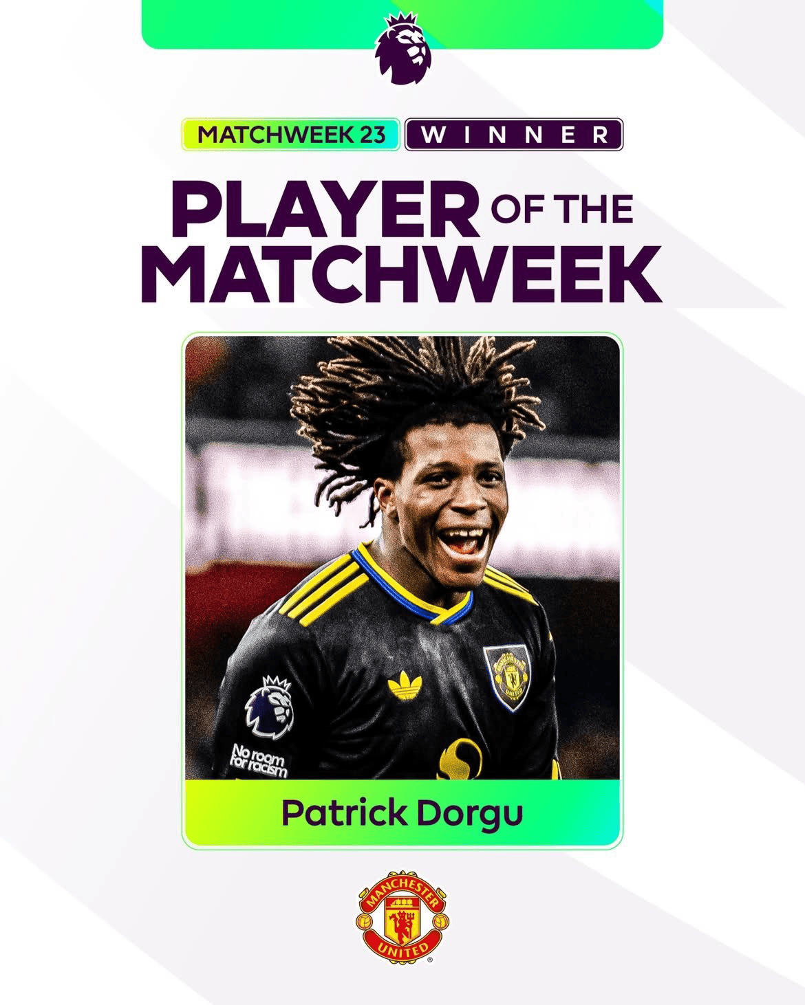 轰出世界波,官方:曼联边锋多尔古当选英超第23轮最佳球员