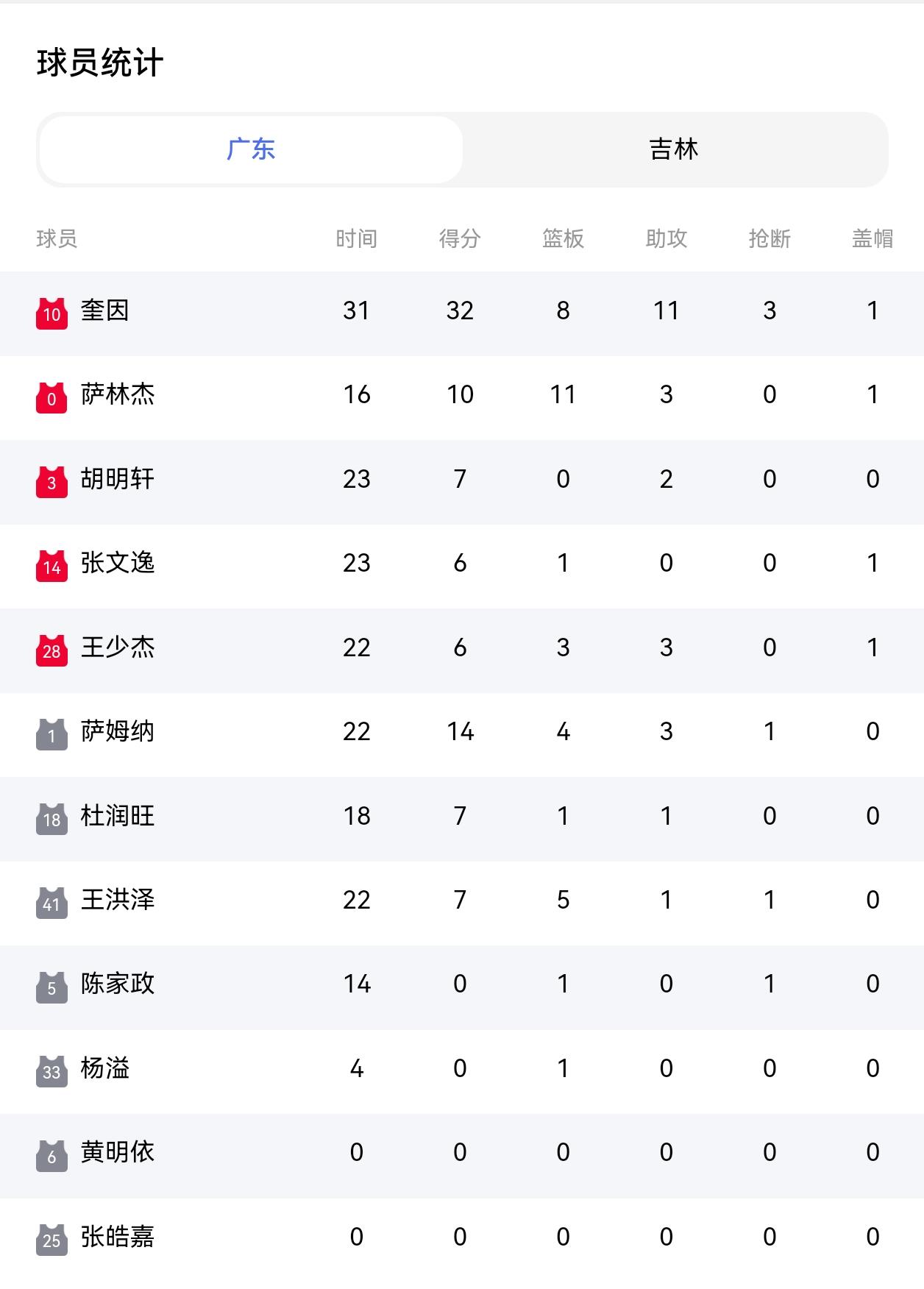 今晚广东轻取吉林,再夺5连胜,目前积分排行联盟第一。今晚奎因32分11助,全场高