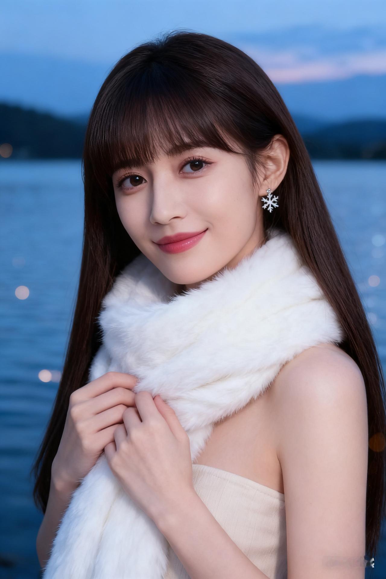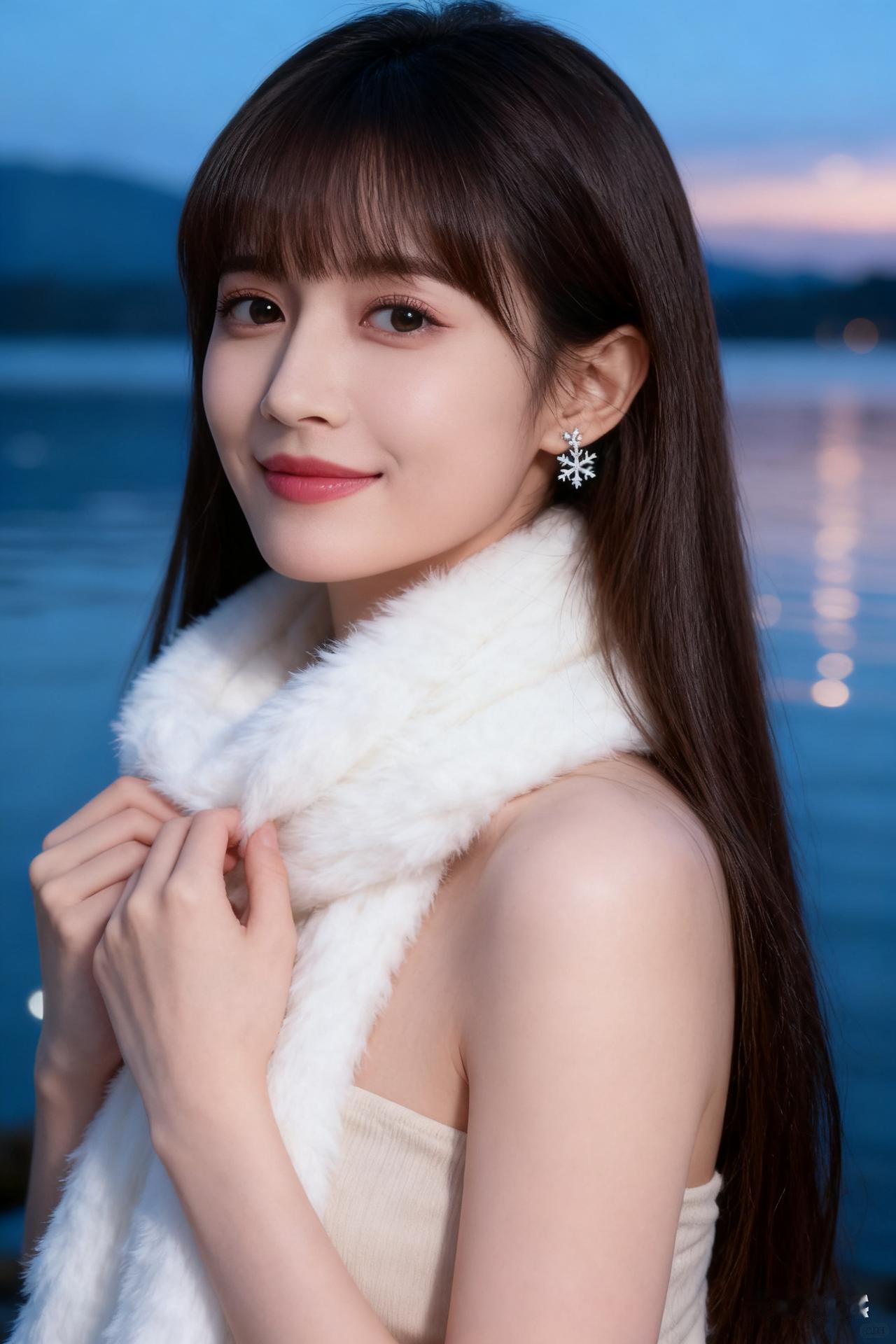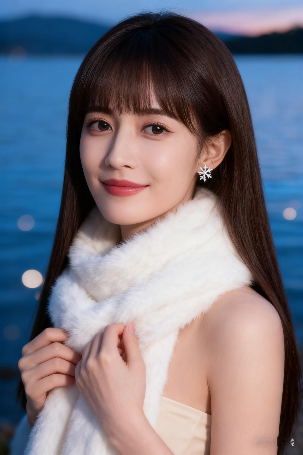 冬日里的温暖时光,毛绒围巾与雪景耳环的完美搭配,甜美笑容照亮整个画面。