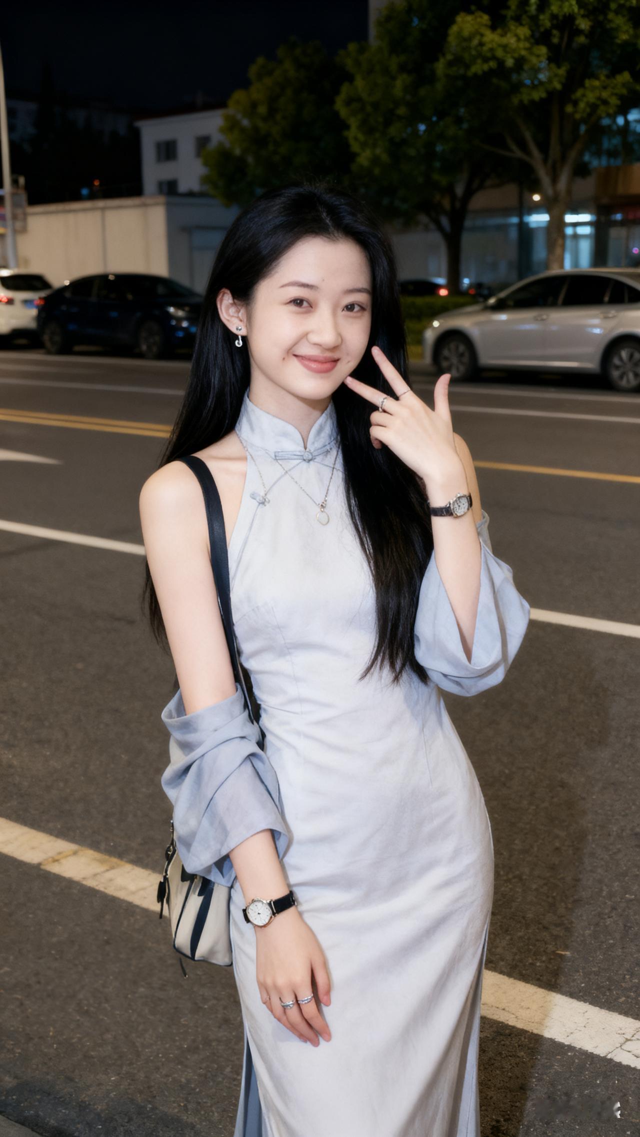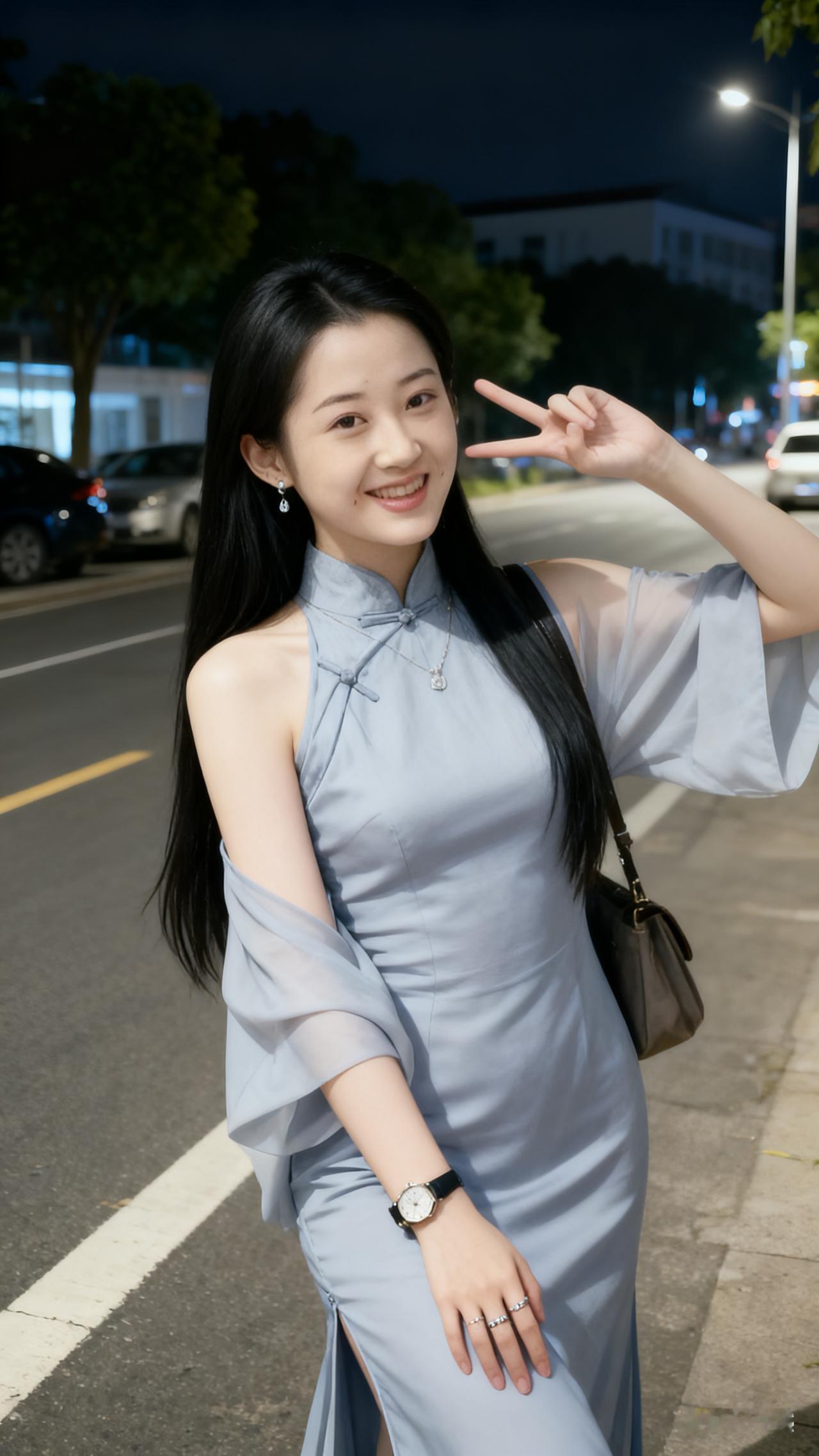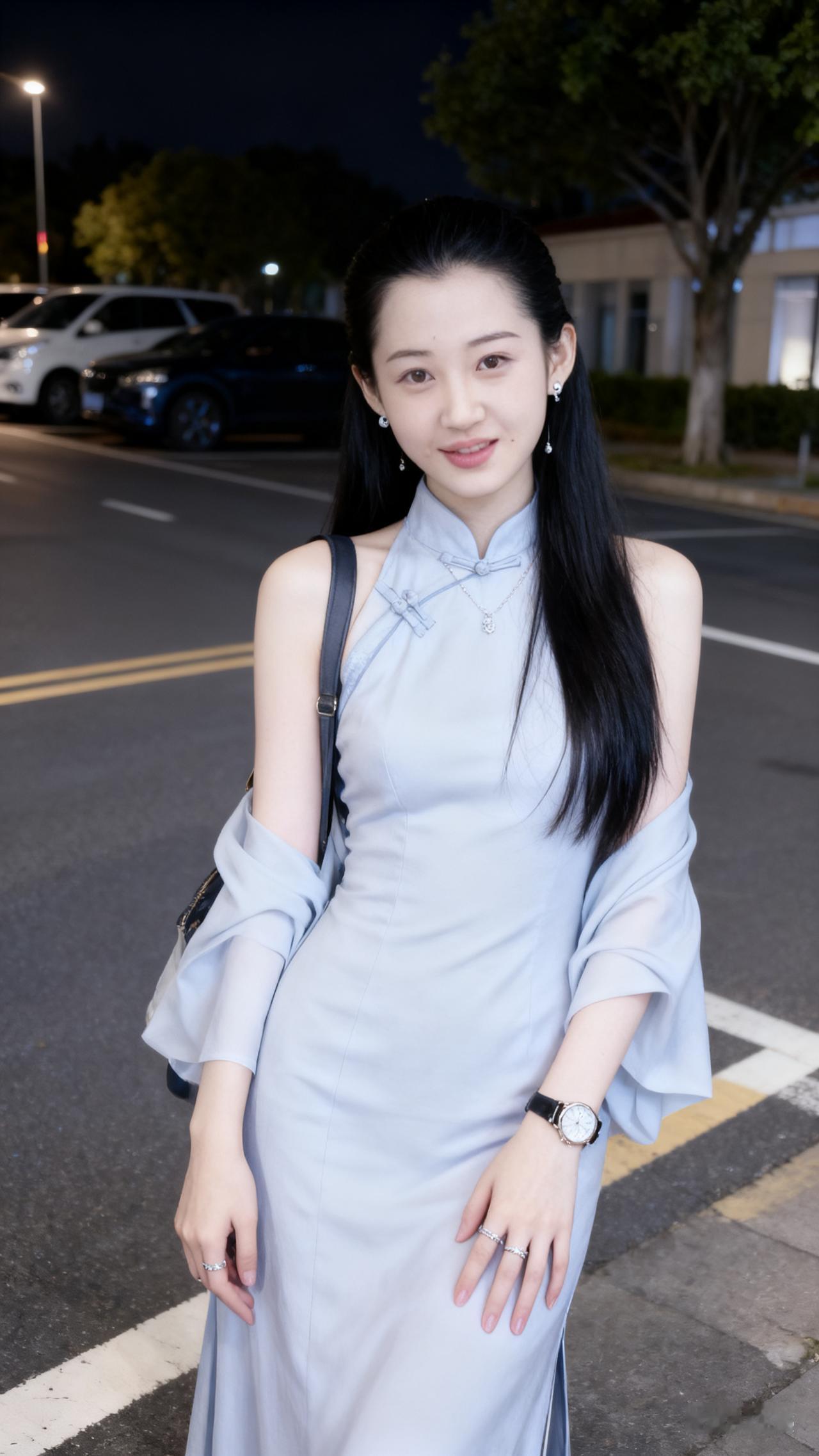 夜晚街头的优雅蓝裙少女,微笑如月光般迷人。