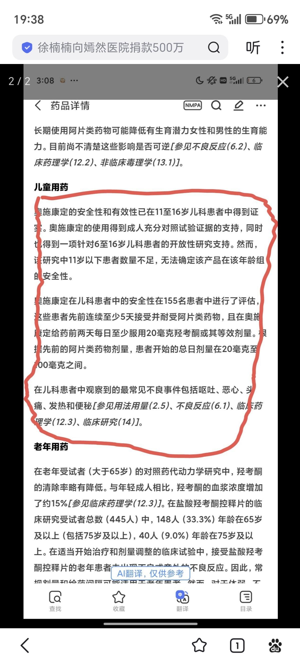 奥斯康定这种成瘾性极强的阿片类止痛药在美国的用药指南真的细思极恐(效果比吗啡强两倍) 其FDA的原版用药说明书明确称可以用于11岁以上未成年人,且对于11岁以下未成年人并不是不安全,而是数量不足无法确定安全性(图二)。。。。 图一是国内的药品说明书,因没有实验数据,不推荐18岁以下使用 看来东大的生物制药产业要赶上美国还有很长的路要走,不和美国医药公司合作临床试验,把实验品不当人基本不可能
