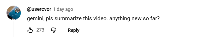 评论区收获了最多点赞数的评论是一条讽刺:“Gemini,麻烦总结下这段视频内容。目前有没有什么新消息?”;也有网友用其他产品进行讽刺,“你好,claude,这个视频会浪费我的时间吗?”
