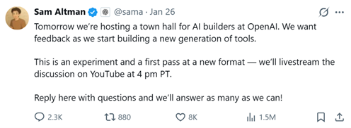 在此前一天,奥尔曼在X账号上对这次活动进行了预告。他表示,希望“在构建新一代工具的过程中获取反馈”,还称这场研讨会是“一次尝试,也是对新形式的初步探索”,并鼓励网友在评论区留下自己想问的问题。
