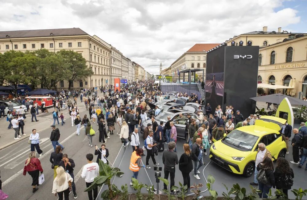 这是2025年9月11日,人们在德国慕尼黑国际车展户外展区比亚迪展区参观的资料照片。