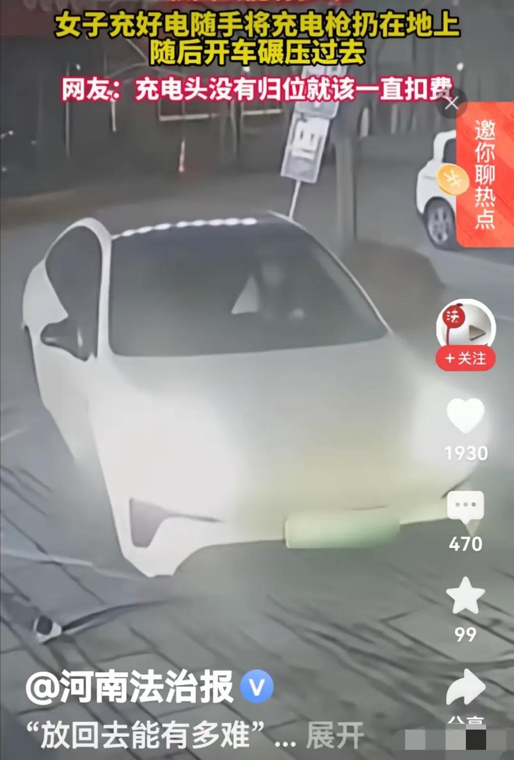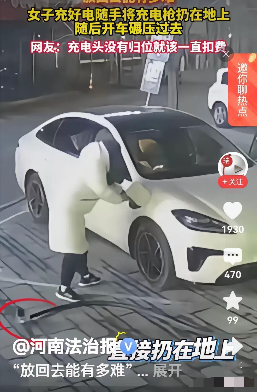 万万没想到!一个漂漂亮亮的女子竟干出了这种见不得人的勾当。1月26日,在山东青岛某充电站,一打扮时尚的年轻女子在给自己的电车充完电后,竟将充电枪扔地上,然后“潇洒”上车,开着车从充电枪上碾压而过。视频曝光后,网上一片哗然,众网友纷纷谴责女子的这一行为。 监控画面里,女子拔掉充电枪的动作干脆利落,随手一扔的姿态却透着满不在乎。她坐进车里发动车辆,轮胎碾过充电枪的瞬间,橡胶外壳发出刺耳的摩擦声,仿佛是对公共财物的公然挑衅。这一幕被充电站的摄像头完整记录下来,很快就在社交平台上炸开了锅。 有人说,这哪是潇洒,分明是没教养。充电枪归位不过是举手之劳,多走两步就能把设备放回原位,既方便下一位车主使用,也能保护价值不菲的充电设备。可在她眼里,公共财物似乎只是自己用完就扔的一次性工具。 更让网友们气愤的是,这种行为并非个例。不少经常跑长途的电车车主都吐槽,自己遇到过充电枪被扔在地上、充电桩被剐蹭的情况。这些损坏的设备不仅需要物业花钱维修,还会耽误其他车主的充电时间,说到底是整个社会在为少数人的自私买单。 有网友提议,应该给充电桩加上“未归位持续扣费”的功能。这个想法听起来有点极端,却戳中了大家的痛点——当道德约束失效时,规则和成本或许能让人多一份自觉。毕竟,谁也不想为自己的懒付出真金白银的代价。 一个人对公共财物的态度,藏着他对他人的尊重程度。你随手一扔的充电枪,可能会让下一位车主蹲在地上半天捡不起来,也可能让维修师傅在寒风里忙活一整晚。这些细碎的小事,恰恰是文明最真实的注脚。 我们总在说细节见人品,这个场景就是最好的例子。比起精致的妆容和时尚的穿搭,愿意为他人多考虑一秒的善意,才是真正的体面。 各位读者你们怎么看?欢迎在评论区讨论。