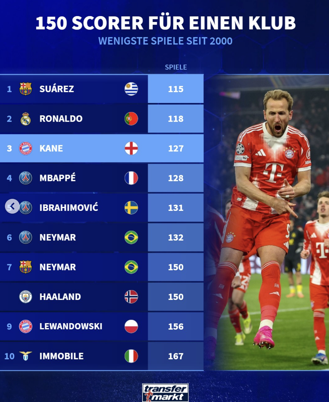凯恩仅仅用了127场就为拜仁打入百球,排名第三。仅次于苏亚雷斯代表巴萨的115场和C罗代表皇马的118场。