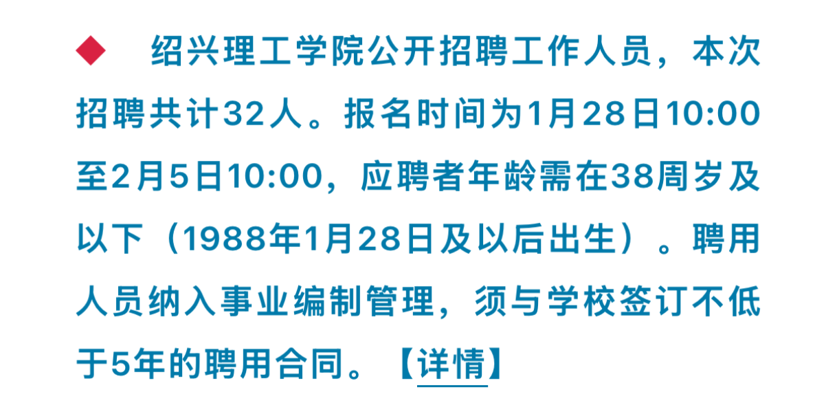 近日,绍兴理工学院发布的一则招聘启事引起了广泛关注(详见《事业编!绍兴理工学院公开招聘》)。该校将部分岗位的招聘年龄限制由35周岁放宽至38周岁。这一细微调整,紧跟公务员招录放宽年龄的趋势,被视为事业单位领域打破“35岁门槛”的一次明确突破。