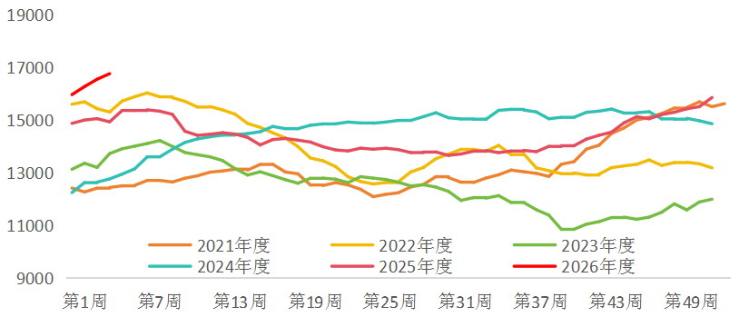 2025年四季度,国内铁水产量触顶回落,终端需求乏力,铁矿石港口库存持续攀升。2025年年末45港总库存为15859万吨,创历史同期新高。2026年累库状态延续,截至1月23日,港口库存环比继续回升至16766万吨,同比增加1832万吨,再创历史同期新高。