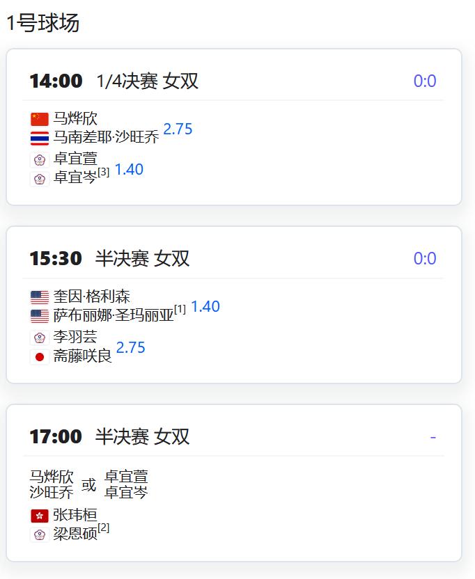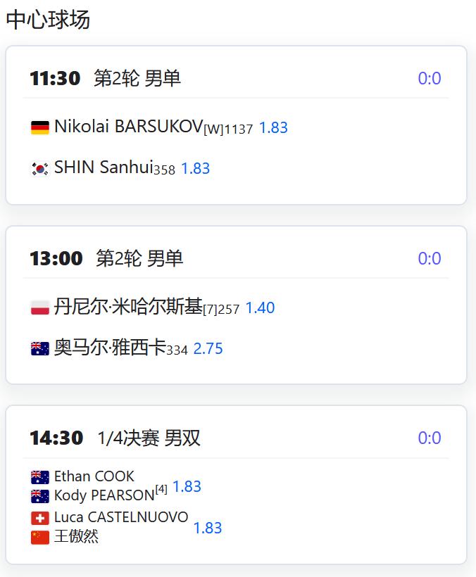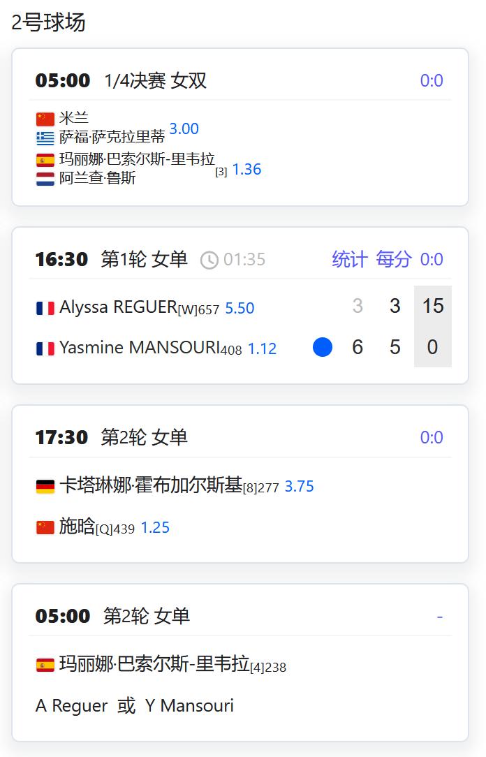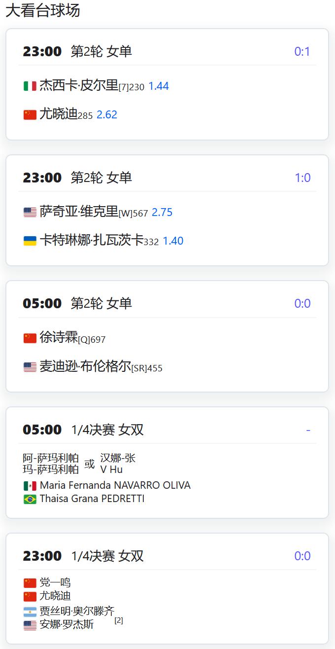 赛程: W125马尼拉,女单四分之一决赛,朱琳将对阵4号种子维基奇; 女双四分之一决赛,马烨欣/沙旺乔将对阵中国台湾的卓宜岑/卓宜萱姐妹花,若晋级,还将继续出战半决赛,对阵2号种子张玮桓/梁恩硕; W75维罗海滩,尤晓迪将在女单第二轮对阵7号种子皮尔里; 徐诗霖将对阵复出的布伦格尔; 女双四分之一决赛,党一鸣/尤晓迪将对阵2号种子奥尔滕齐/罗杰斯; CH50藩切,男双四分之一决赛,王傲然组合将对阵4号种子澳洲组合; W50莫纳斯提尔,女单第二轮,施晗将对阵8号种子霍布加尔斯基; 女双四分之一决赛,米兰/萨克拉里蒂将对阵3号种子巴索尔斯/鲁斯。