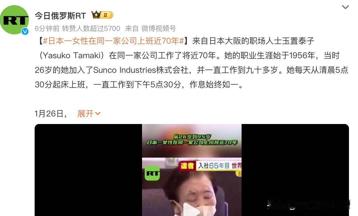 日本一女子在同一家公司上班67年,硬生生熬死三代老板九十多岁才退休,堪称职场司马懿。在日本大阪就有这么一位人物叫玉置泰子,从26岁开始就在同一家公司上班,直到93岁才从公司退休。想象一下,这位老人从早上五点半就开始起床上班,下午五点半下班,一干就是67年。这需要什么样的意志力和清醒的头脑?在视频中该女子还噼里啪啦的敲键盘,玩儿得十分顺溜。有人说,公司老板太好了,居然让一个员工工作到93岁。是啊,是要多么好的老板才让员工90多岁还退不了休,想当年退休年龄从60延迟到65岁,好多人都直接开骂了,更何况93岁?