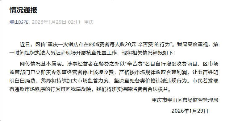 1月29日,重庆市璧山区市场监督管理局发布情况通报称,第一时间组织执法人员赶赴现场开展核查处置工作,网传情况基本属实。涉事经营者在餐费之外以“辛苦费”名目自行增设收费项目,区市场监管部门已立即责令涉事经营者停止该项收费,严格按市场规律收取合理利润,让老百姓明明白白消费。