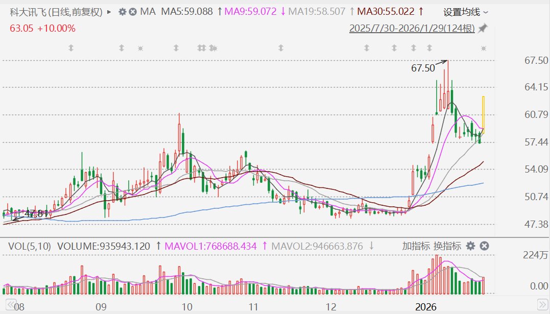 格隆汇1月29日|科大讯飞(002230.SZ)盘中拉升封涨停板,报价63.05元。消息面上,公司昨晚发布公告,预计2025年归属于上市公司股东的净利润为7.85亿元-9.50亿元,比上年同期增长40%-70%。
