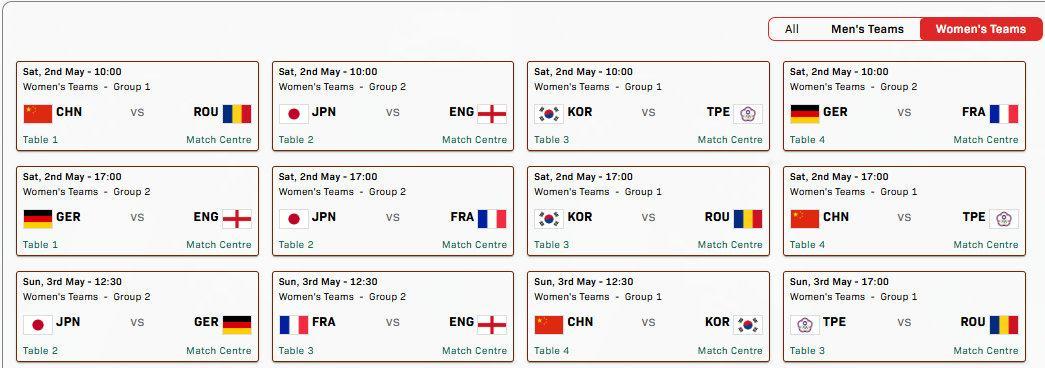 20260502|伦敦世乒赛赛程5月2日17:00(北京时间)女子团体Group A小组赛桌号:T1中国女团VS罗马利亚女团5月2日19:30(北京时间)男子团体Group A小组赛桌号:T1中国男团VS英格兰男团5月3日00:00(北京时间)女子团体Group A小组赛桌号:T4中国女团VS中国台北女团5月3日02:30(北京时间)男子团体Group A小组赛桌号:T4中国男团VS韩国男团5月3日19:30(北京时间)男子团体Group A小组赛桌号:T1中国男团VS瑞典男团5月3日19:30(北京时间)女子团体Group A小组赛桌号:T4中国女团VS韩国女团