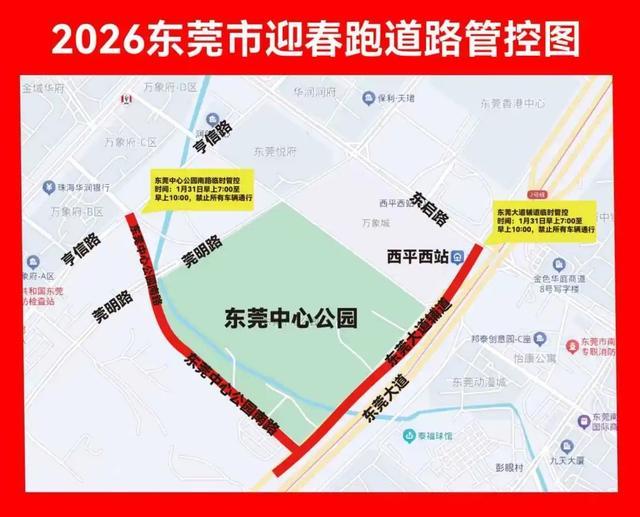 2026东莞市迎春跑活动将于2026年1月31日在东莞市中心公园举行。为保障活动顺利进行,确保活动道路交通安全畅通,根据《中华人民共和国道路交通安全法》,第三十九条之规定,决定活动期间对部分道路实施交通管制,具体事项通告如下:
