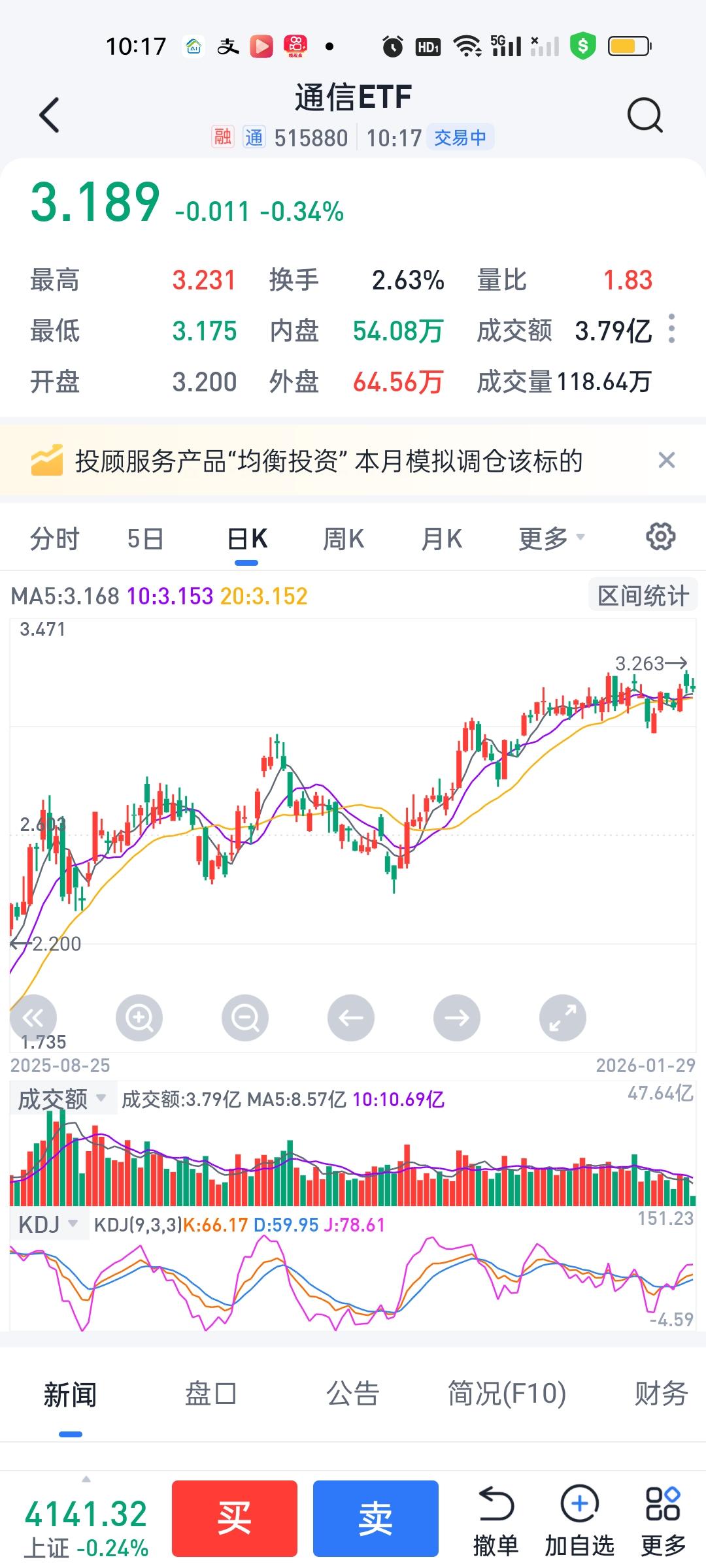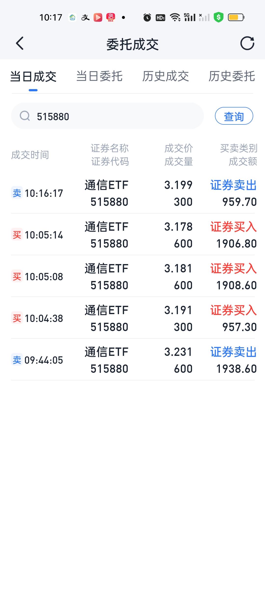 通信的操作不能算特别成功。做了一个倒T和一个正T,把900股底仓全部卖出然后又买进了1500股,2.231这个算是卖在了早上的最高点,这个是比较有成就感的。2.231出2.181进,50个基点600股挣了30元,3.178进3.199出,21个基点300股挣了6.3元。后面我再想办法操作。场内证券账户目前盈利200元。