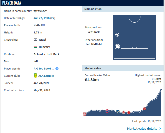 虎扑01月29日讯根据德转数据,前蓉城球员古尔芬克尔已签约塞浦路斯顶级联赛球队AEK拉纳卡。