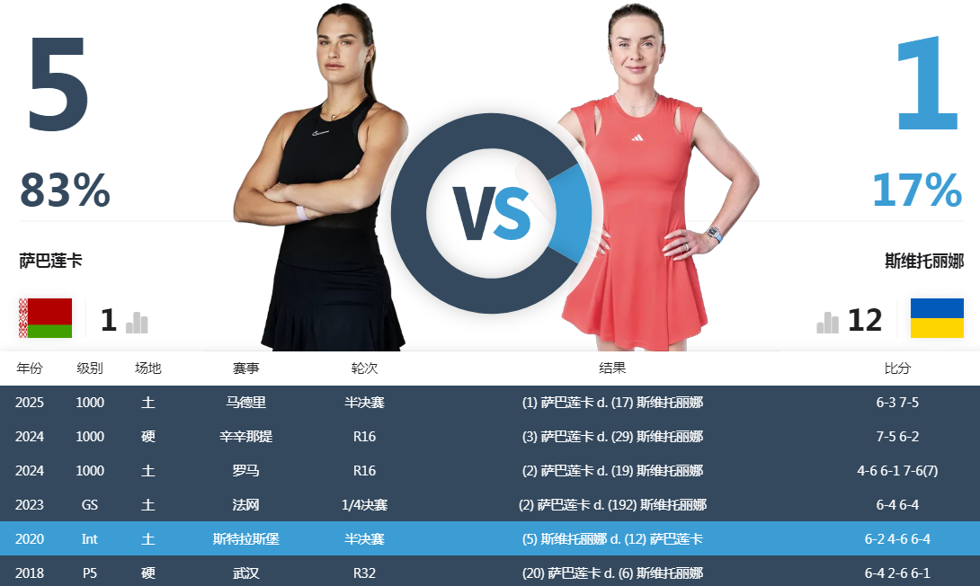 双方在巡回赛有过6次交手,萨巴伦卡交手记录5-1领先斯维托丽娜,近4战取四连胜。