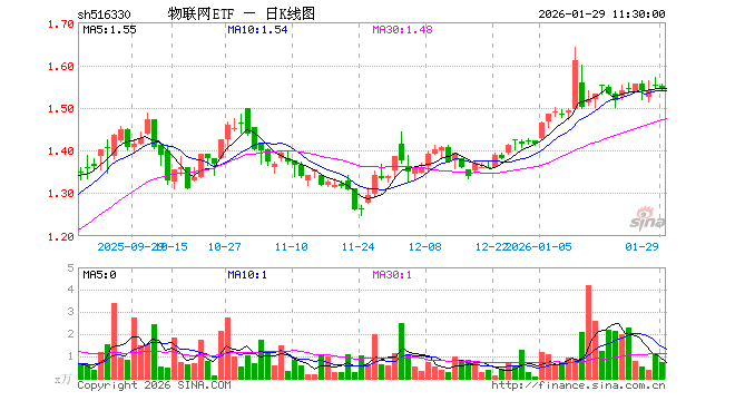 1月29日,截止午间收盘,物联网ETF(516330)跌0.45%,报1.543元,成交额115.71万元。物联网ETF(516330)重仓股方面,中际旭创截止午盘跌1.79%,立讯精密跌2.20%,汇川技术跌0.39%,兆易创新跌3.50%,美的集团涨1.65%,中兴通讯跌1.19%,科大讯飞涨10.00%,海康威视涨0.06%,豪威集团跌3.44%,海尔智家跌0.96%。
