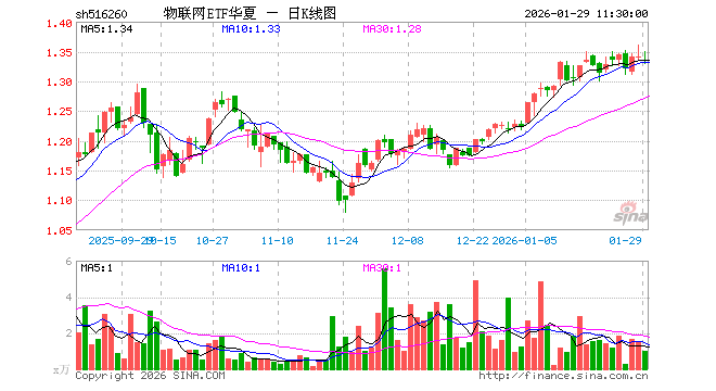 1月29日,截止午间收盘,物联网ETF华夏(516260)跌0.52%,报1.333元,成交额132.29万元。物联网ETF华夏(516260)重仓股方面,中际旭创截止午盘跌1.79%,立讯精密跌2.20%,汇川技术跌0.39%,兆易创新跌3.50%,美的集团涨1.65%,中兴通讯跌1.19%,科大讯飞涨10.00%,海康威视涨0.06%,豪威集团跌3.44%,海尔智家跌0.96%。