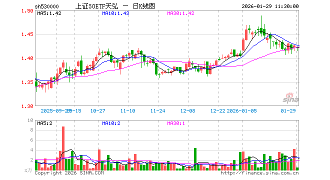 1月29日,截止午间收盘,上证50ETF天弘(530000)跌0.35%,报1.421元,成交额63.39万元。上证50ETF天弘(530000)重仓股方面,贵州茅台截止午盘涨3.72%,中国平安涨0.71%,紫金矿业涨3.00%,招商银行涨0.16%,兴业银行跌0.70%,长江电力跌0.82%,寒武纪跌1.69%,中信证券跌0.64%,恒瑞医药涨0.23%,工商银行涨0.14%。