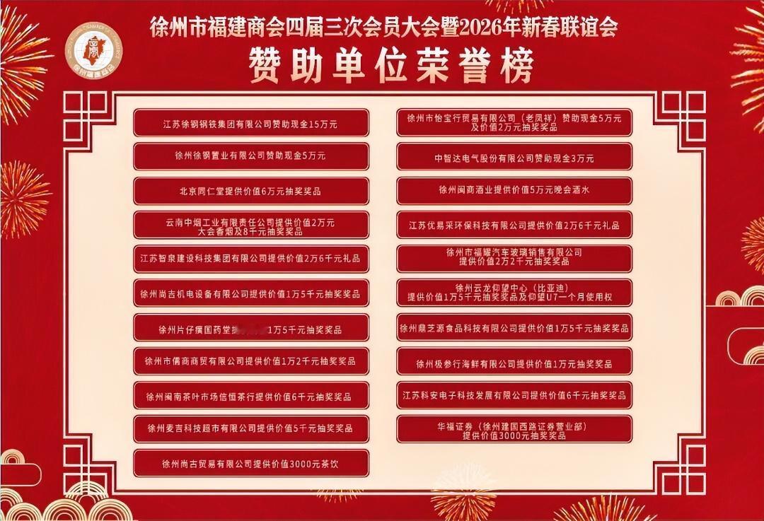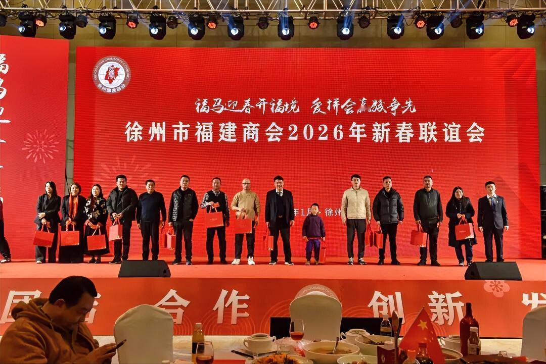 1月25日,徐州市福建商会四届三次会员大会暨新春联谊会在徐州绿地铂瑞酒店隆重召开。市政协副主席、市工商联主席王海永,市人大常委会原副主任、市企业联合会会长赵兴友,市民政局党委书记、局长吴彬,市委统战部副部长、市工商联党组书记秦玉锦,市工商联党组成员、副主席汤辉,市侨联副主席史抒庆,鼓楼区政府负责人等领导嘉宾出席会议。徐州市异地商会、其他友好商会的代表和商会全体会员500余人齐聚一堂,总结2025,谋划2026,共贺马年新春!