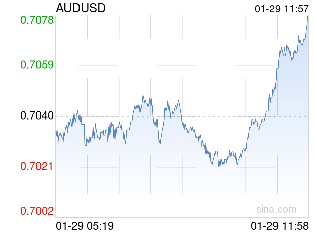 新浪外汇消息2026年01月29日,截至11时57分,外汇市场上澳元兑美元汇率突破1澳元兑换0.7077美元。涨幅为0.5256%