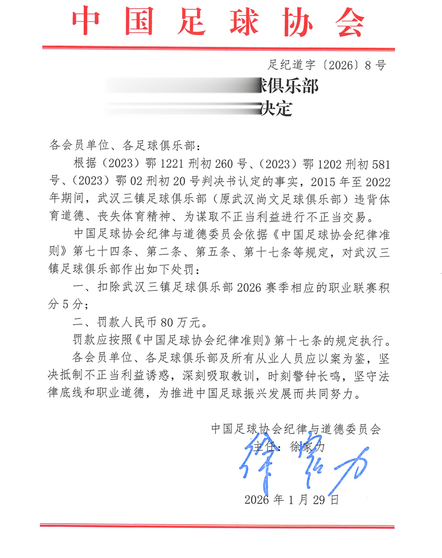 虎扑01月29日讯在中国足协公布的处罚决定中显示,武汉三镇在2015-2022赛季期间存在不正当交易行为。