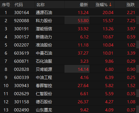 上证报中国证券网讯1月29日午后,油气股再度拉升,截至13时14分,通源石油20cm涨停,准油股份、石化油服、中曼石油涨停,潜能恒信、新锦动力涨超10%,贝肯能源、中油工程等跟涨。