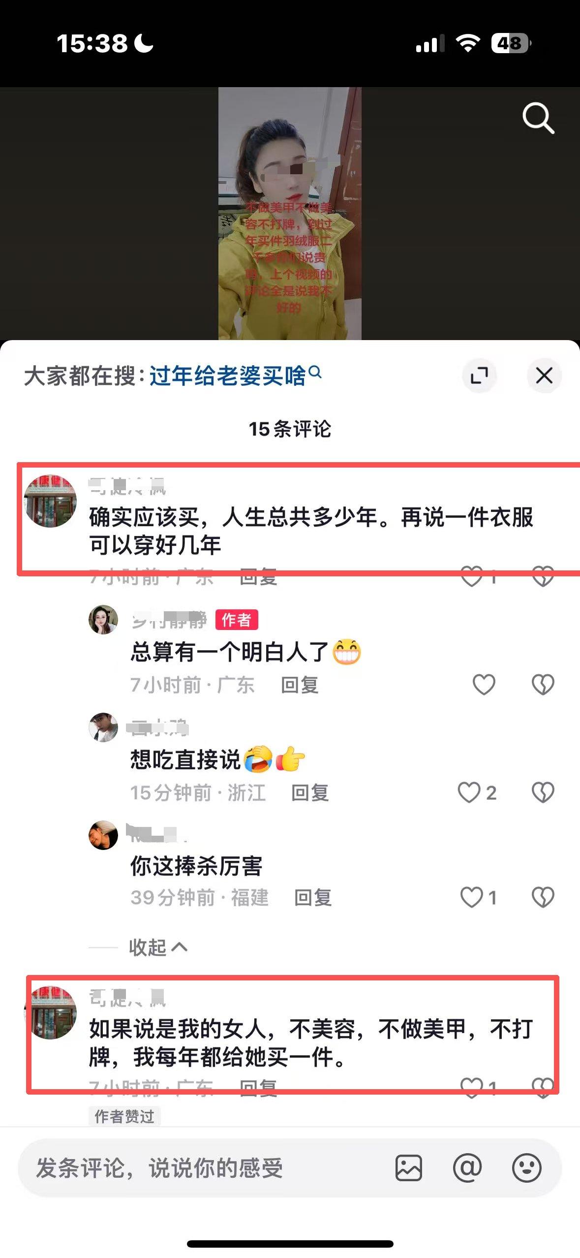 好一个老公赚钱老婆花,老婆一件羽绒服2759元,老公一件棉袄才59块钱,那个猝死的程序员老婆也是类似的配置,家庭力工此刻具象化了。 这差距比人和狗的差距都大。 评论区那只龟男为了交配在那捧杀,恶心死了。