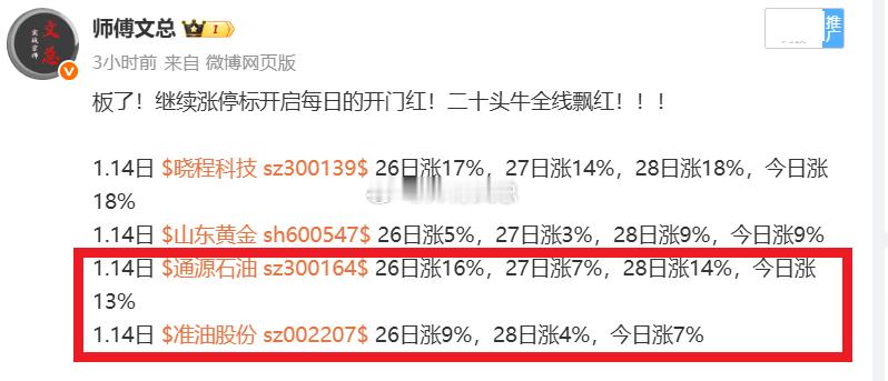 下午一看,又板了三个!爽!$通源石油 sz300164$ 20CM上板$准油股份 sz002207$ 强势上板$中曼石油 sh603619$ 强势上板