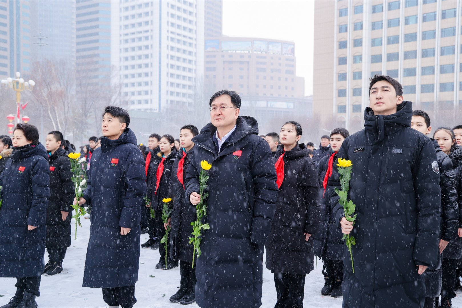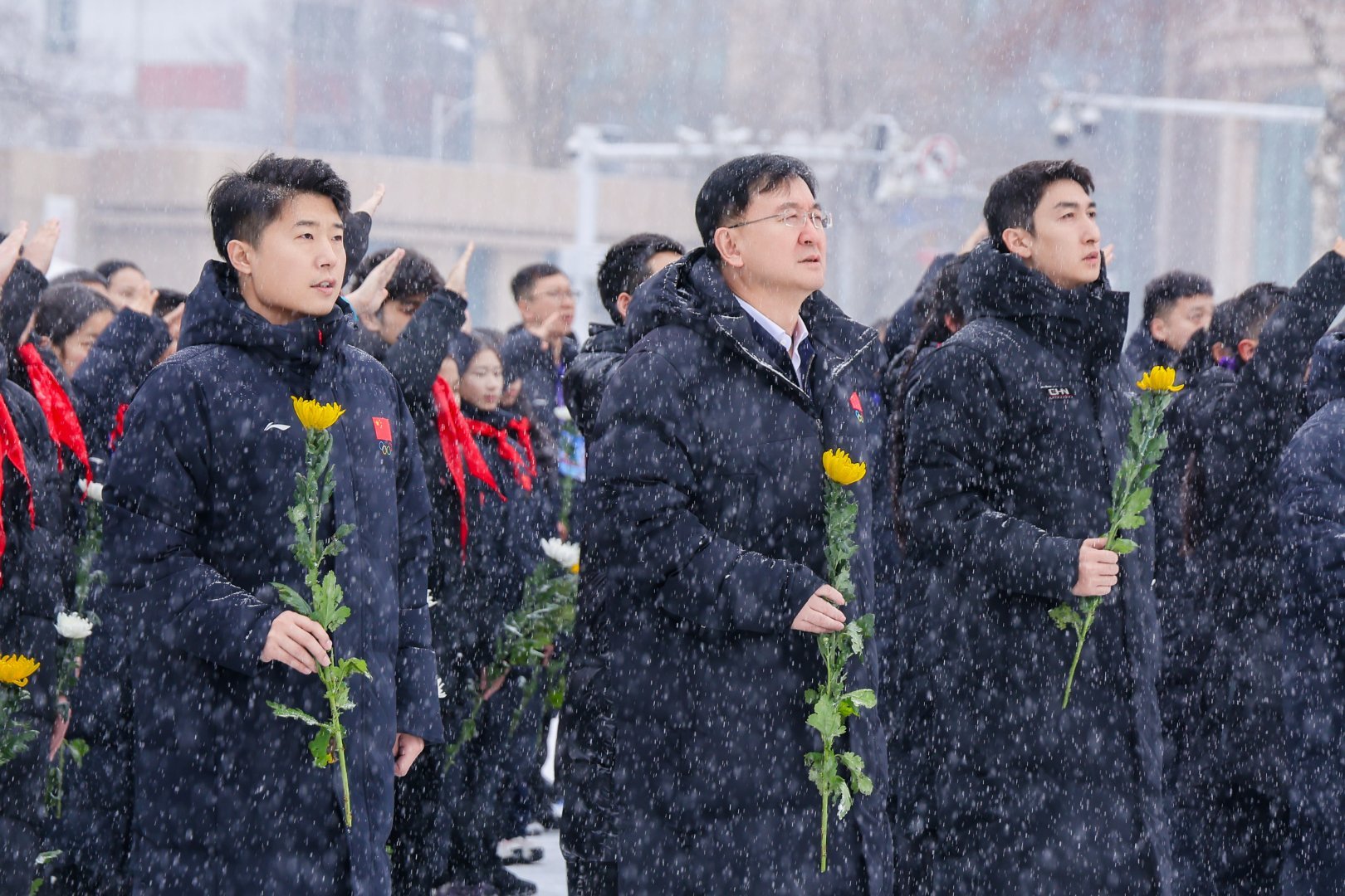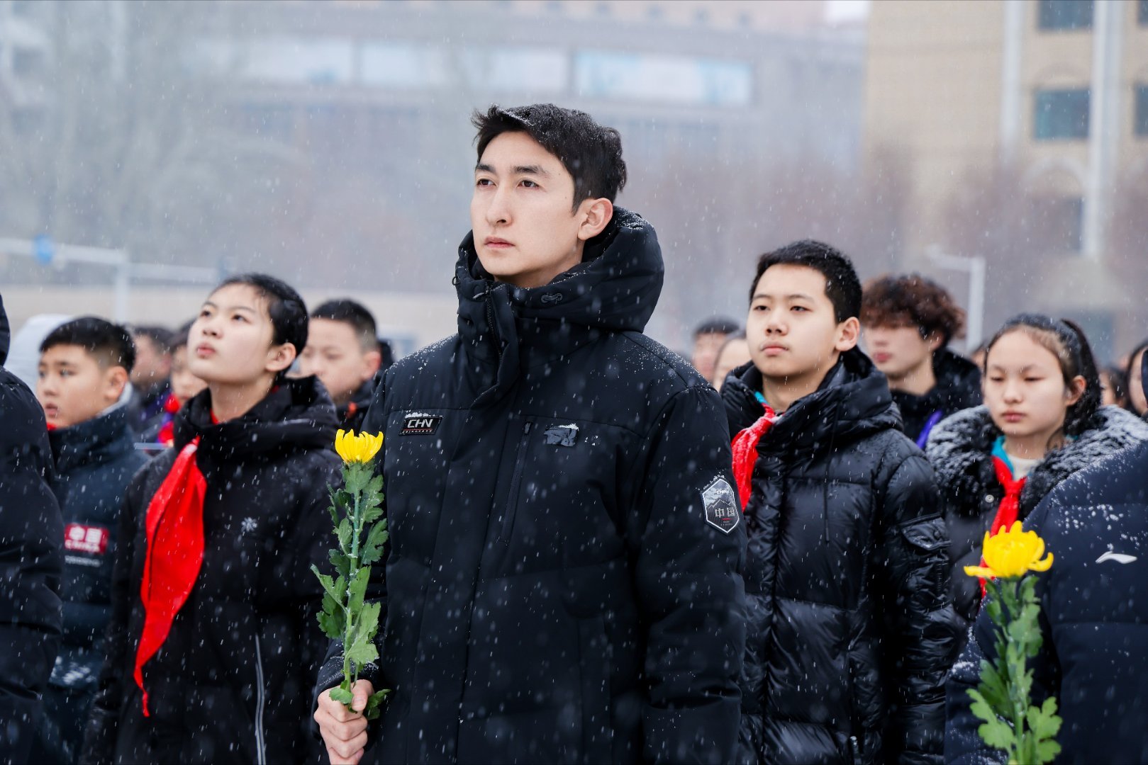 阳光体育大会现场,武大靖带领青少年代表向人民英雄敬献鲜花,在庄严肃穆的氛围里缅怀
