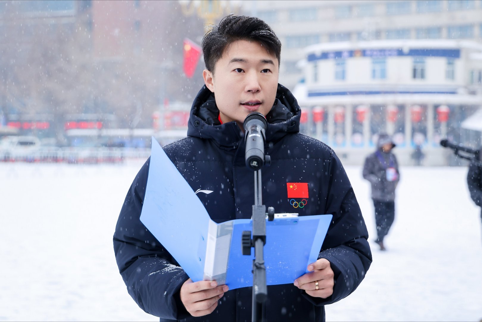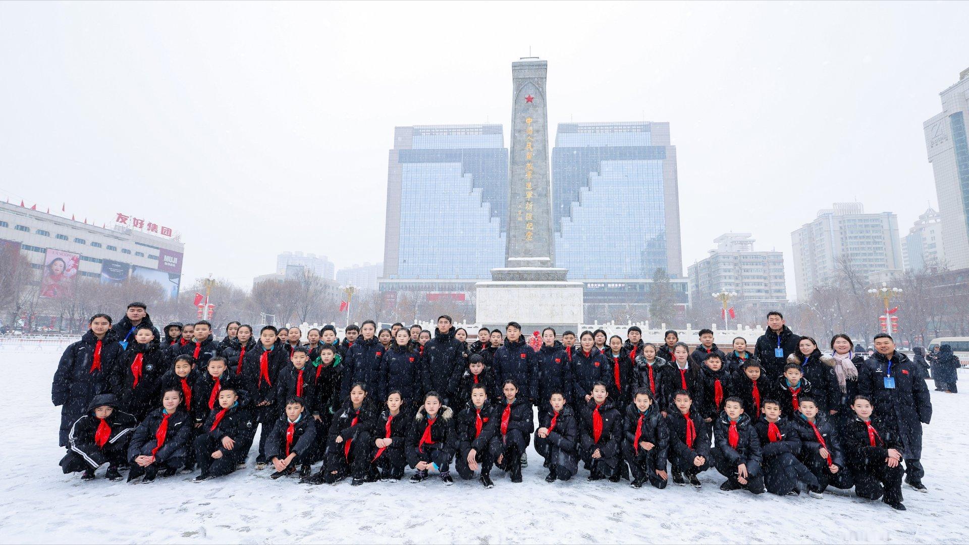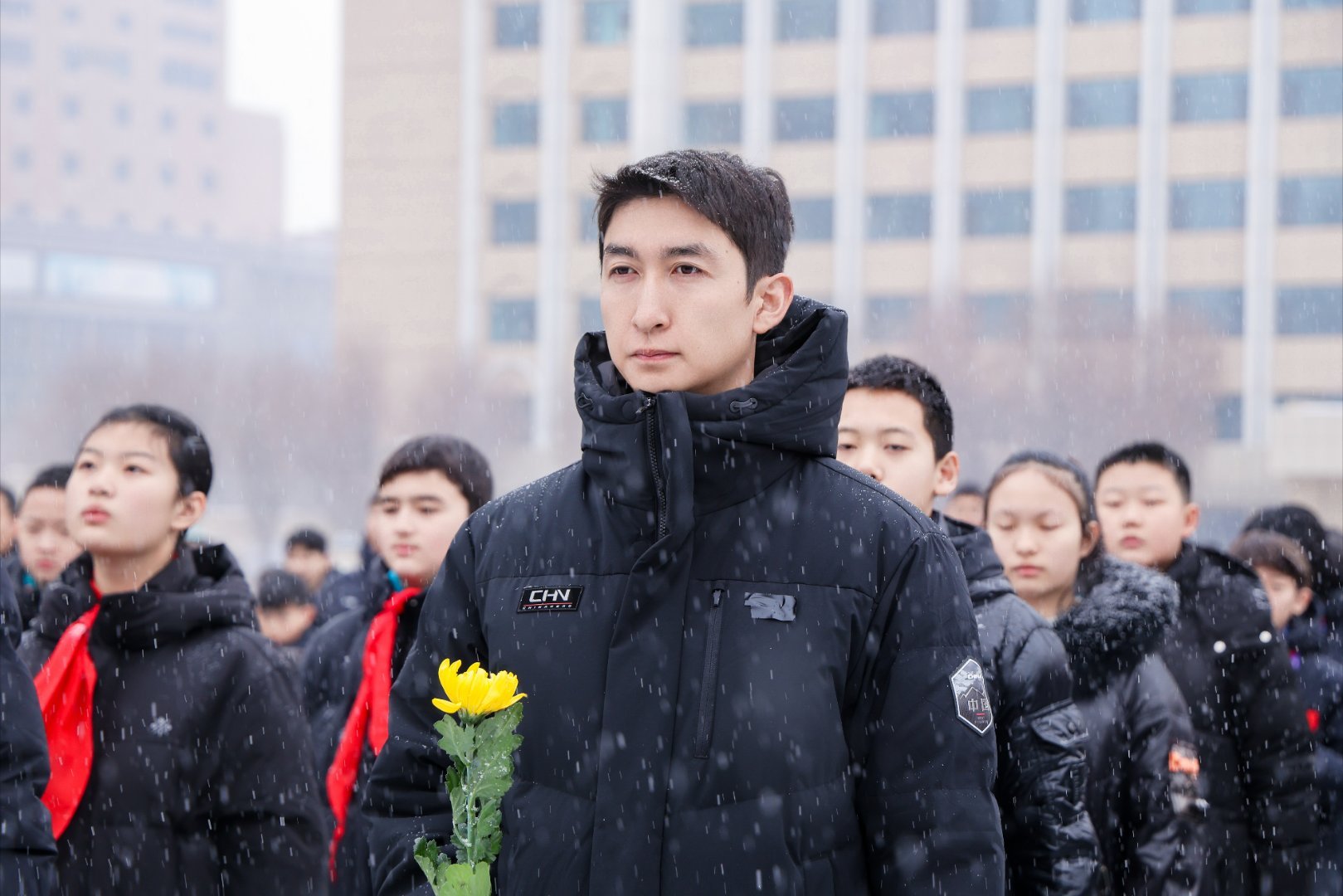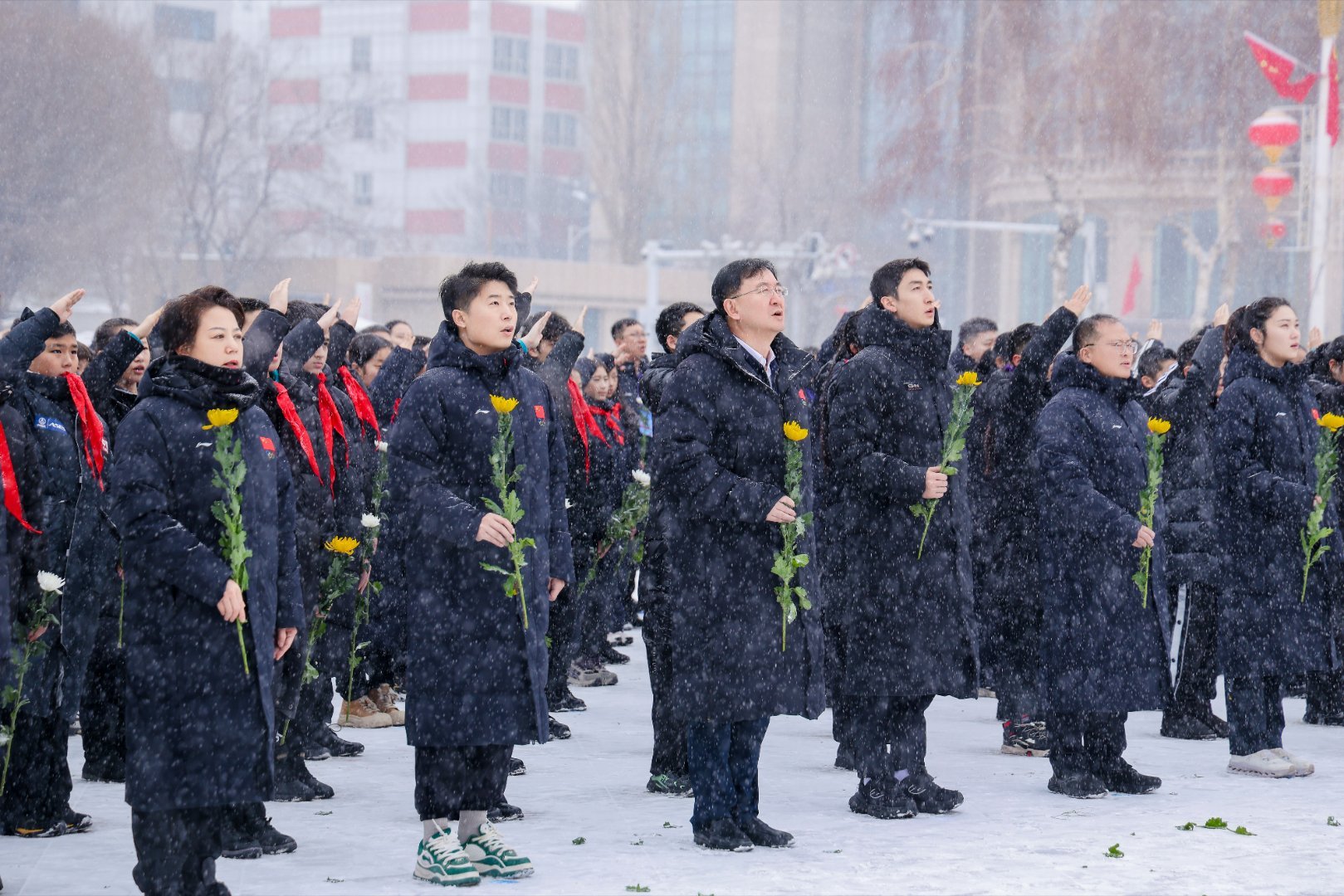 阳光体育大会现场,武大靖带领青少年代表向人民英雄敬献鲜花,在庄严肃穆的氛围里缅怀