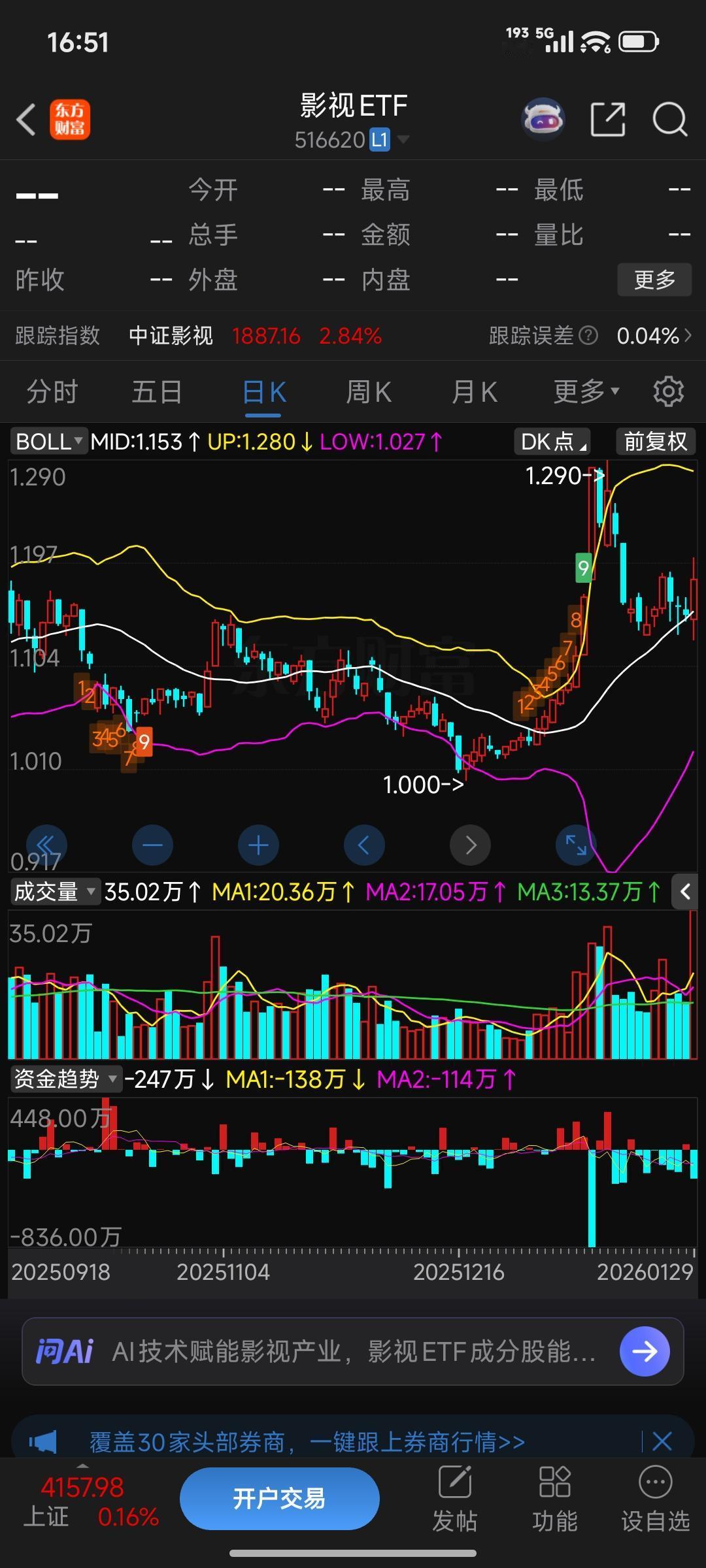 老林和小李的ETF闲聊 小李(挠着头,盯着电脑屏幕):林哥,最近影视和传媒板块这么火,我想跟着喝点汤,但翻了一圈股票,选来选去都怕踩坑,这选股困难症又犯了! 老林(端着保温杯,笑着走过来):哈哈,这简单啊,你要是怕选错个股,直接买ETF不就行了?比如影视ETF(516620)和传媒ETF(159805),既能跟上热点,又不用纠结选哪只票。 小李(眼睛一亮):哦?这俩有啥区别?您给我讲讲呗。 老林:先说说影视ETF(516620),全称是国泰中证影视主题ETF,2021年成立的,跟踪的是中证影视主题指数。规模目前0.79亿,成分股都是光线传媒、完美世界、万达电影这些影视产业链上的公司,从制作到发行再到院线都覆盖了。 小李:那它最近表现咋样? 老林:你看它的日K线,去年12月跌到1块钱之后就开始反弹,最高冲到1.29块,这一个多月涨了11%呢。技术面上布林线开口向上,价格在中轨和上轨之间跑,是多头格局。成交量也放大了,说明资金在进场,不过最近资金趋势有点小幅流出,得留意一下。 小李:那为啥涨这么好? 老林:一来是春节档票房预期拉满,二来AI技术赋能影视内容生产,加上政策对文化产业的支持,这几个因素一起推的。不过也要注意,影视板块弹性大,要是春节档票房没达标,或者资金赚够了跑了,回调起来也快。 小李:明白了,那传媒ETF(159805)呢? 老林:这个是鹏华中证传媒ETF,2020年成立的,跟踪中证传媒指数,规模有4.79亿份,比影视ETF大不少。成分股覆盖得更全,分众传媒、恺英网络、昆仑万维这些游戏、广告营销的公司都在里面,不只是影视。 小李:听着好像更猛? 老林:那可不,它去年12月见底1.293块后直接起飞,最高涨到1.912块,一个多月涨了40%,今天单日就涨了4.14%!技术面上布林线中轨一直往上走,回踩了一下又反弹,成交量一直很高,资金趋势也是大幅净流入,明显是资金扎堆看好。 小李:这么猛,啥原因啊? 老林:核心是AI+营销、AI+游戏的商业化落地,还有GEO概念的催化,让整个传媒板块都火了。不过风险也在这儿,短期涨太多了,技术面有回调需求,而且得盯着AI应用能不能真的赚到钱,还有行业政策会不会变。 小李(边听边记):我总结一下,影视ETF更聚焦影视产业链,弹性中等,回调压力也中等;传媒ETF覆盖整个传媒板块,弹性更高,资金关注度也高,但短期回调压力更大? 老林(笑着点头):没错,就是这个理。你要是想稳一点,选影视ETF;要是想博更高弹性,就看传媒ETF,反正都比你瞎选个股靠谱。 小李:行!林哥,我这就去研究研究。对了,您能不能帮我整理一份这俩ETF的核心成分股清单?我想看看具体是哪些股票在涨。 老林:没问题,等下我发你。