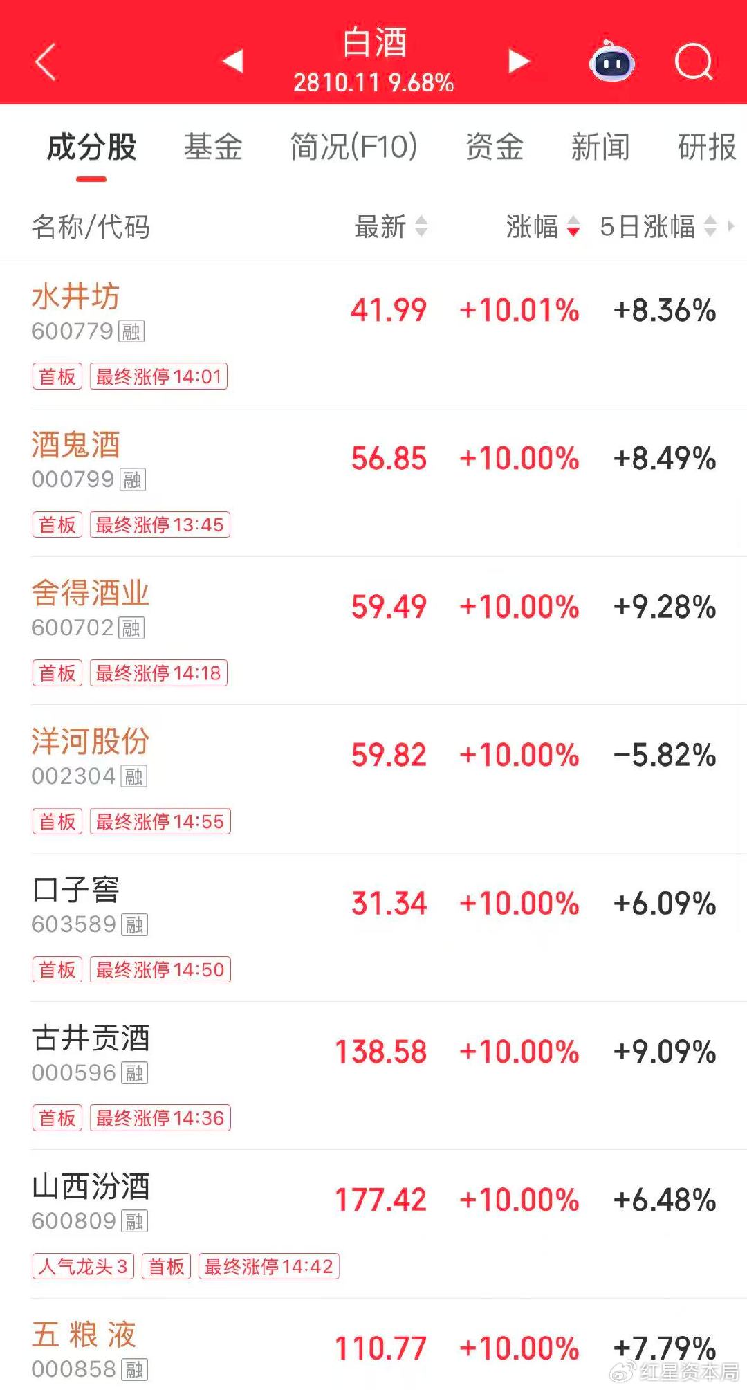 截至收盘,据红星资本局不完全统计,五粮液(000858.SZ)、泸州老窖(000568.SZ)、舍得酒业(600702.SH)、水井坊(600779.SH)、口子窖(603589.SH)、洋河股份(002304.SZ)、山西汾酒(600809.SH)、古井贡酒(000596.SZ)、酒鬼酒(000799.SZ)等16只白酒股涨停,贵州茅台(600519.SH)盘中一度涨超9%,截至收盘涨8.61%。