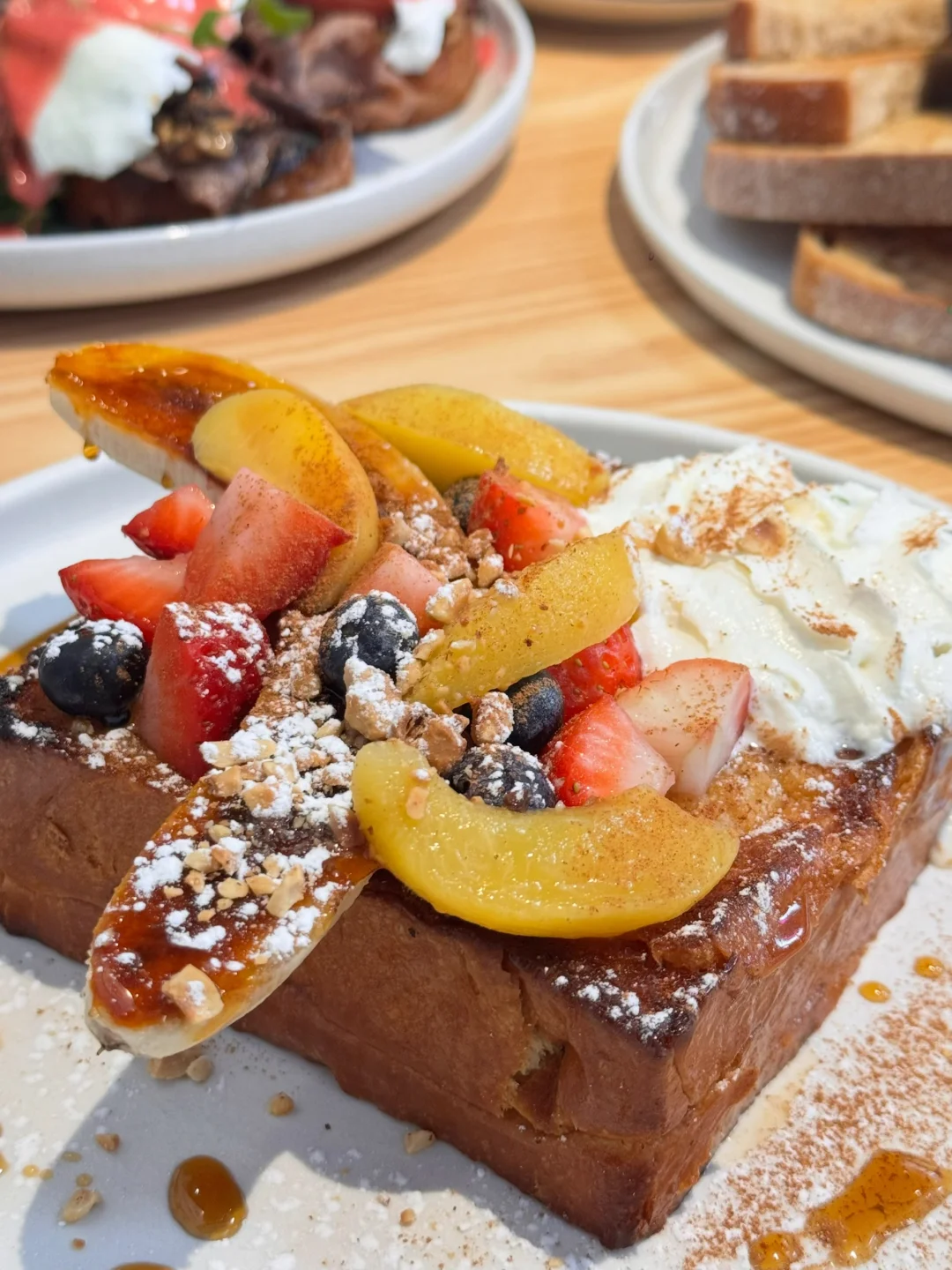 ☑️French Toast(图1️⃣2️⃣)少女心直接融化💕厚切吐司外酥内软,淋上枫糖浆甜度刚刚好,铺满新鲜草莓🍓蓝莓🫐黄桃🍑还有焦糖香蕉🍌拍照颜值第一名