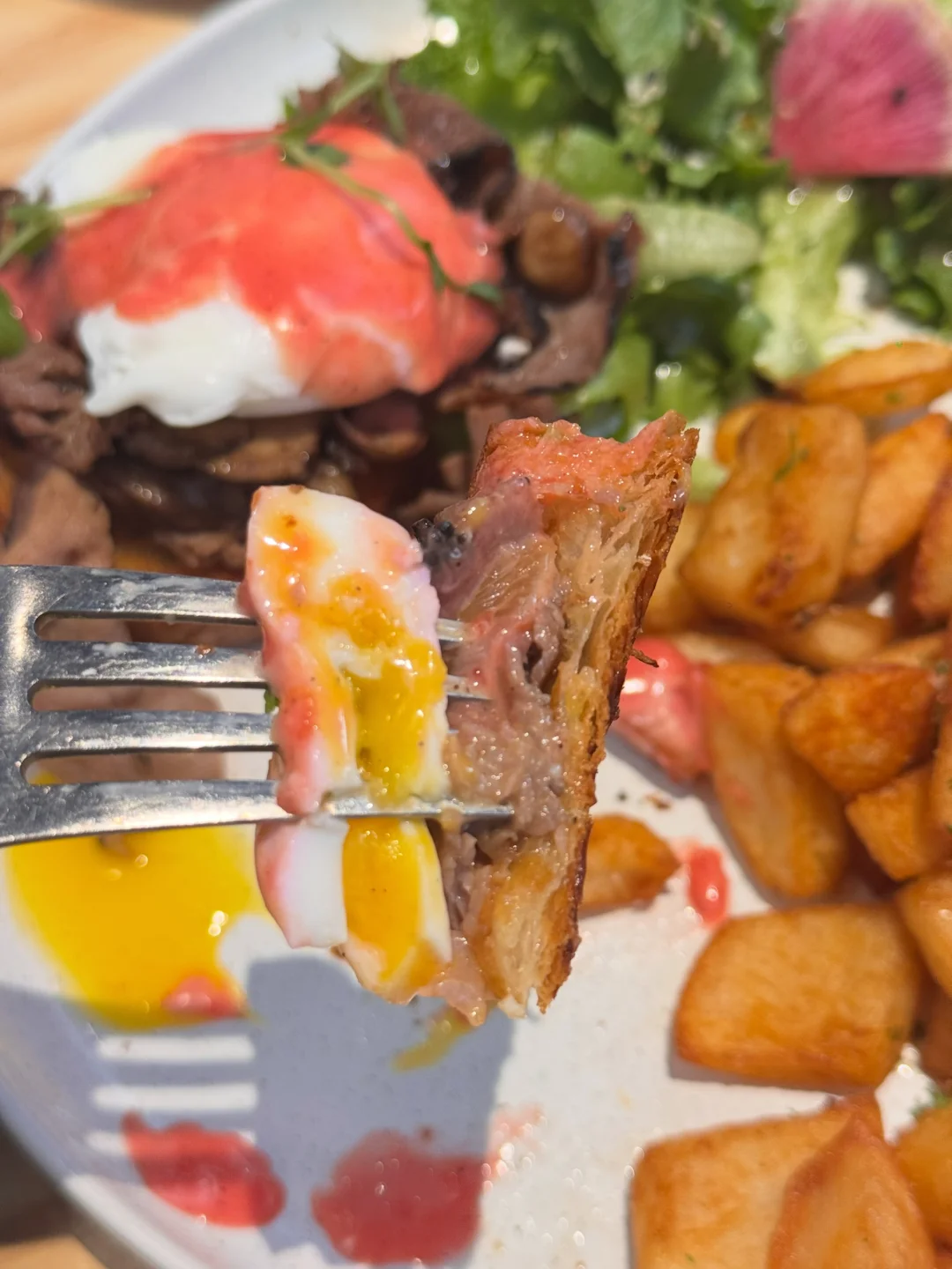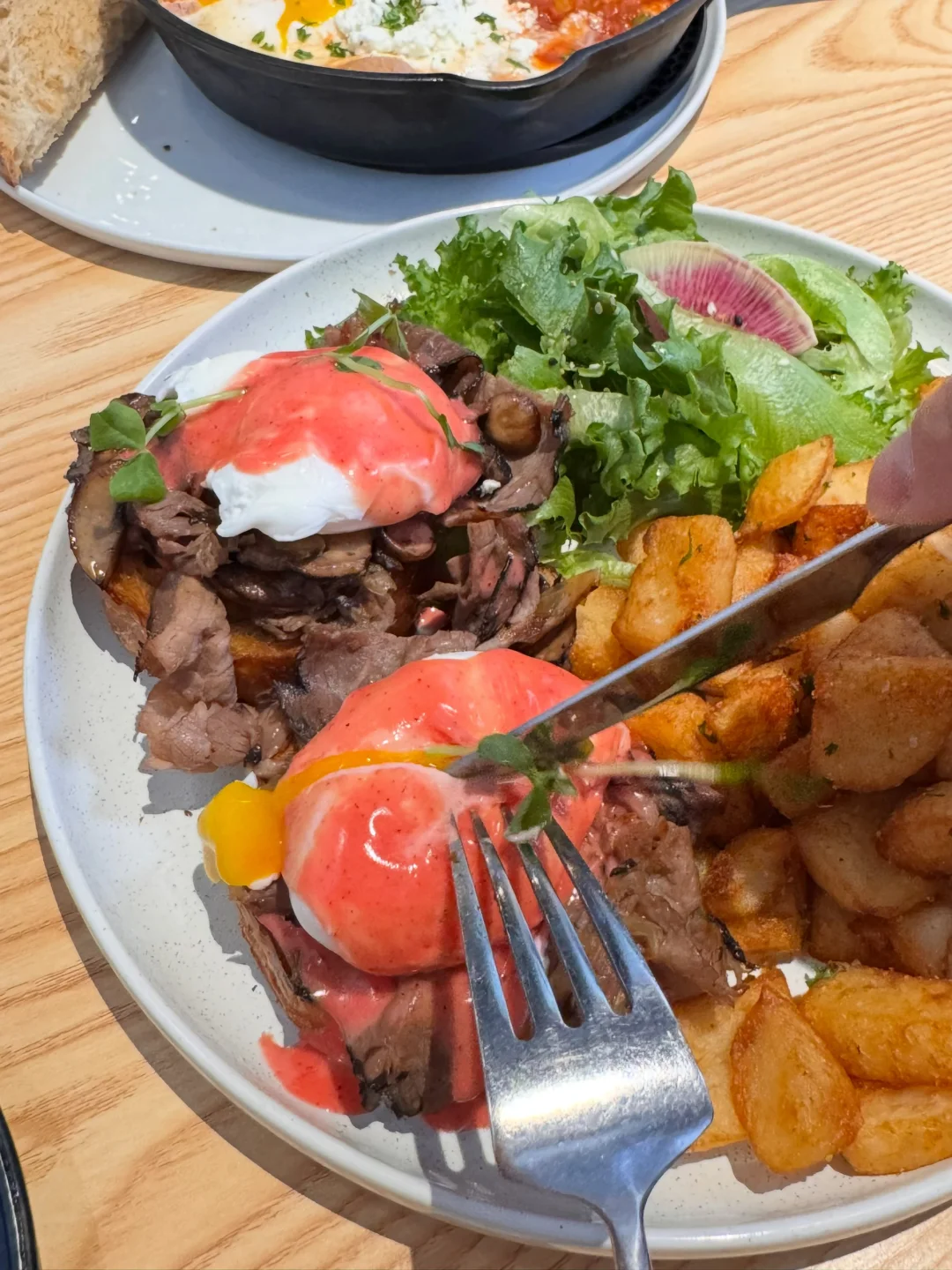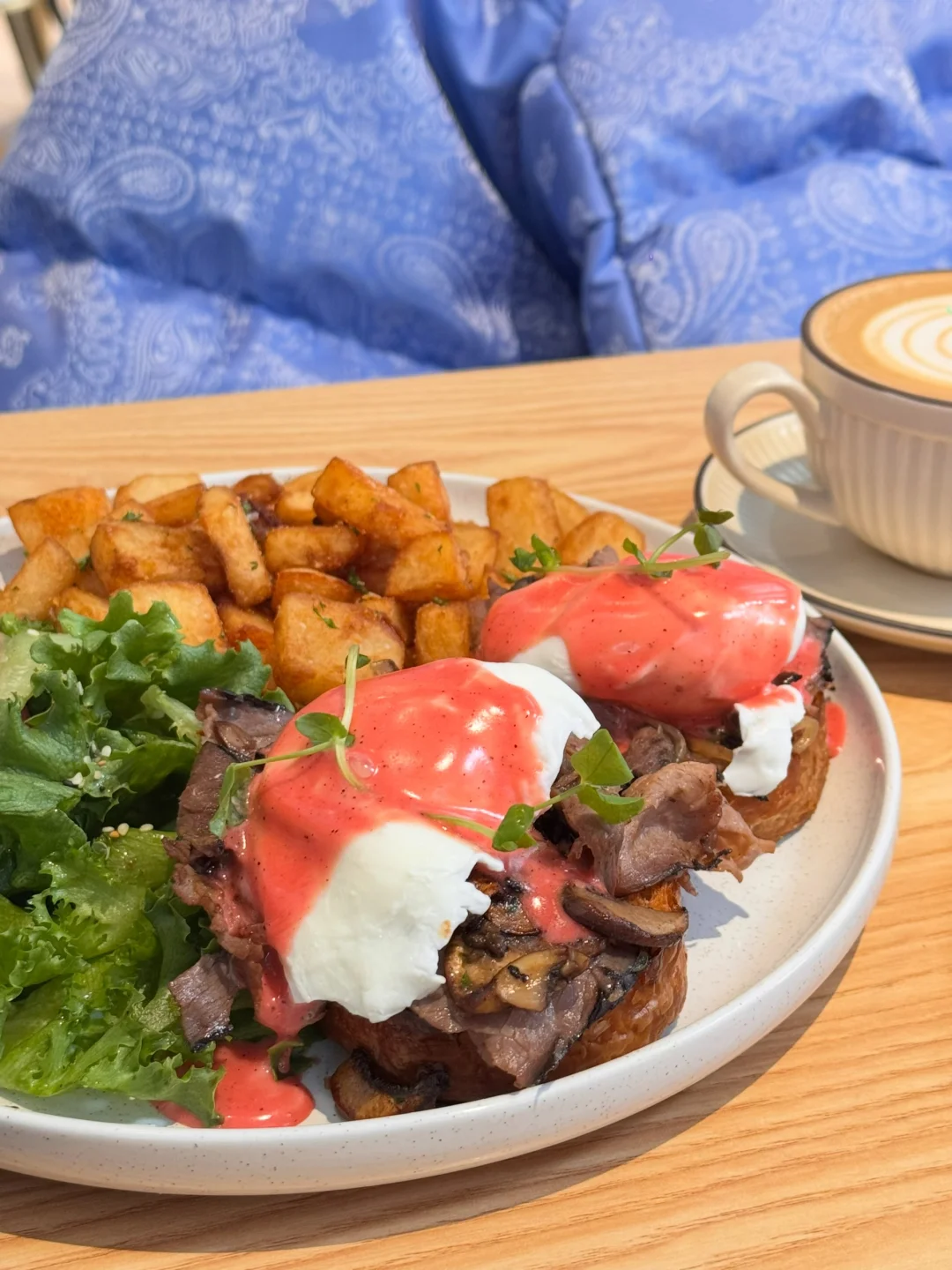 ☑️Roasted Beef Benedict(图8️⃣)一刀切开蛋液像瀑布一样流下来‼️烤牛肉分量超实在,搭配的红色火龙果荷兰酱清新不腻,还有蘑菇🍄🟫在里面,底下年轮可颂烤得酥脆 一口下去层次感绝了👍