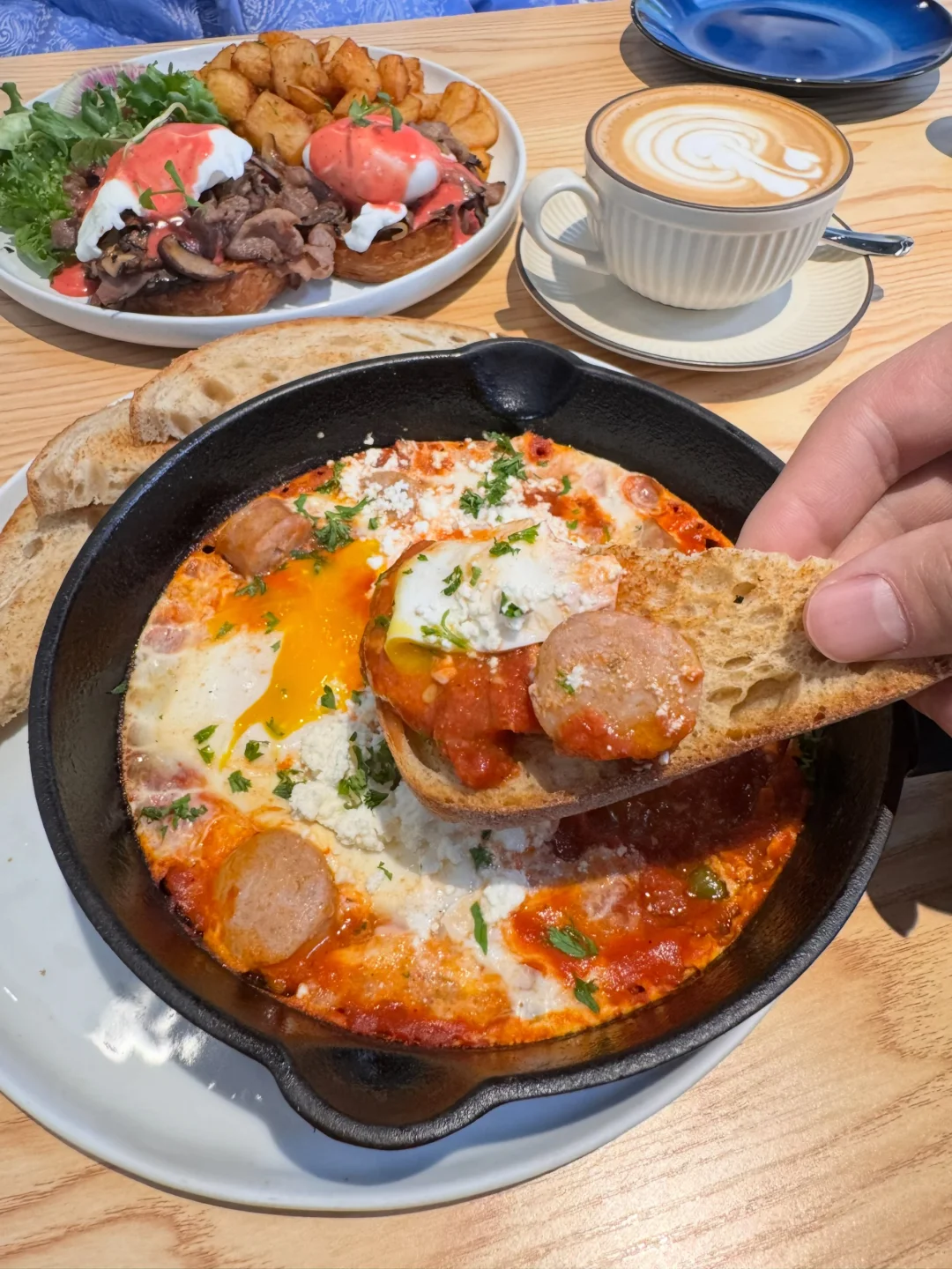 ☑️Sausage Shakshuka(图1️⃣1️⃣)北非蛋爱好者狂喜!酸甜番茄浓汤里卧着两颗溏心蛋,手工香肠咬开还会爆汁,用烤得香脆的面包蘸着吃,简直快乐满分💯