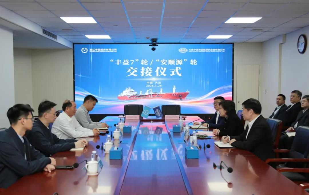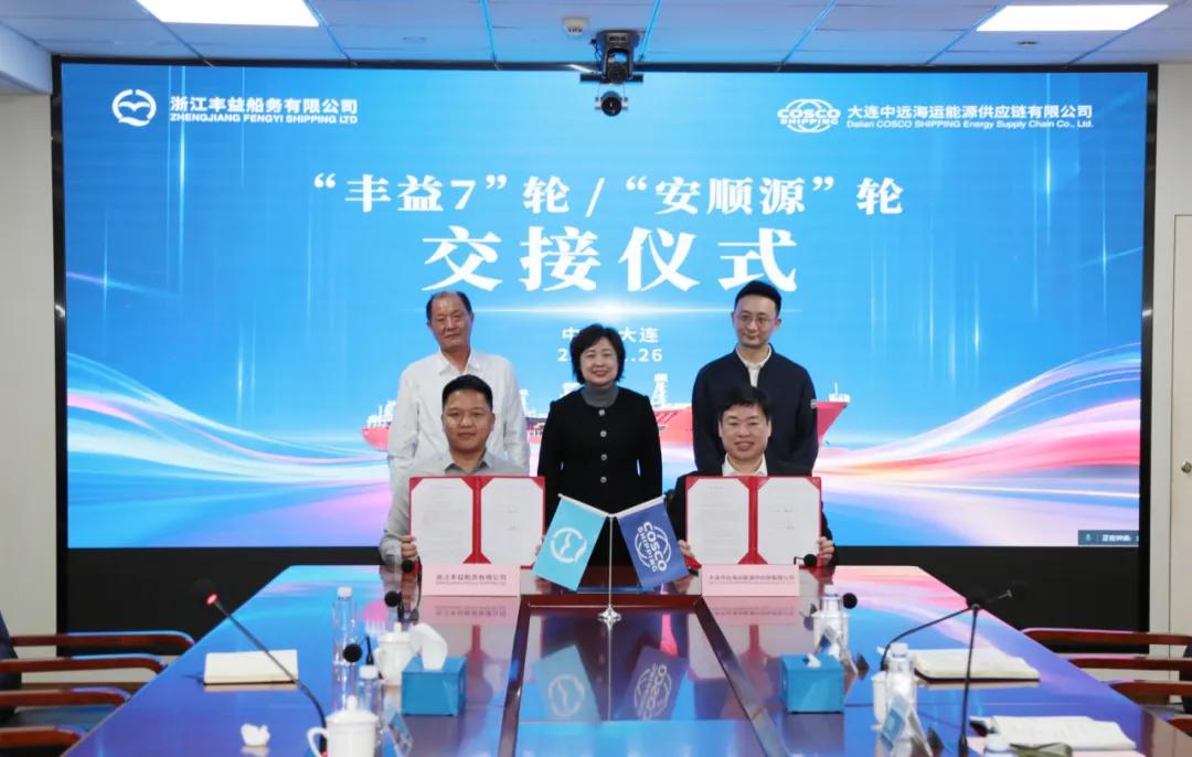 大连海能董事总经理、党委副书记赵春波和浙江丰益船务有限公司总经理潘海杰代表双方签署船舶交接协议。