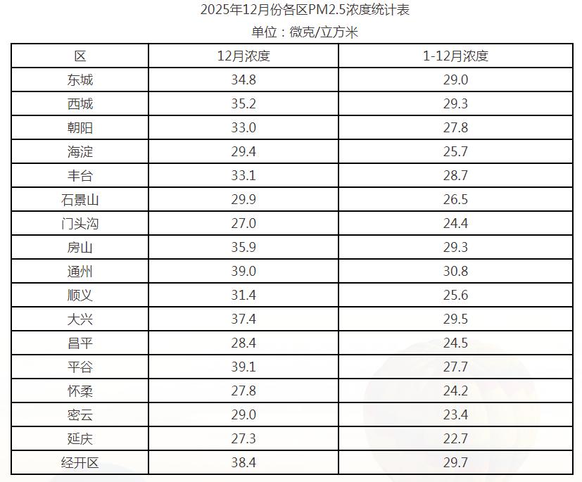 12月份,各区PM2.5浓度在27.0-39.1微克/立方米之间,门头沟、延庆、怀柔等区浓度较低,平谷、通州、经开区等区浓度较高。