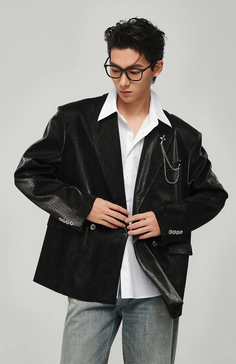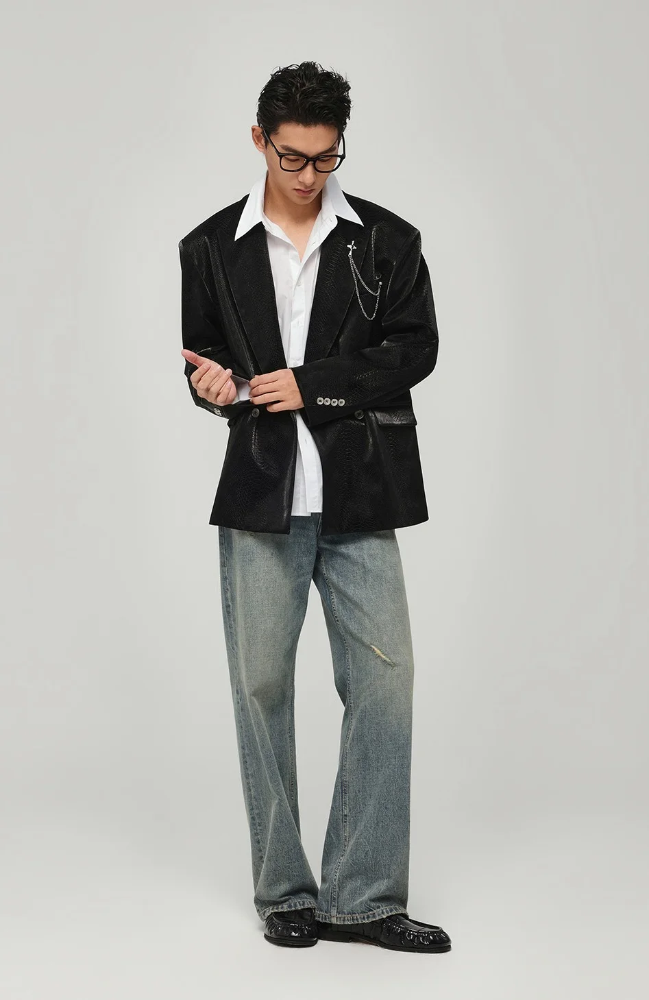 智感职场:黑色蛇纹 x 丹宁混搭 想要日常通勤不呆板?用黑色蛇纹款混搭浅色牛仔裤。 压纹在光影下若隐若现,低调却有张力。 搭配一副黑框眼镜,这种“高智感”职场穿搭在真的很吃香