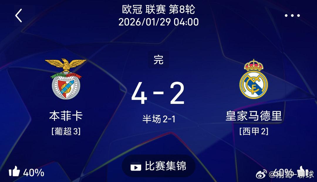 4-2爆冷皇马!本菲卡门将读秒绝杀 穆帅创神迹 本菲卡4比2皇马 北京时间1月29日凌晨,2025-26赛季欧冠收官战上演经典对决,穆里尼奥执教的本菲卡主场4-2掀翻皇马,门将特鲁宾第98分钟头球读秒绝杀,球队以1个净胜球优势惊险锁定附加赛席位,63岁穆帅率队完成绝境逆袭。此役皇马早早由姆巴佩双响取得攻势优势,但本菲卡凭借谢尔德鲁普梅开二度、帕夫利季斯点球破门实现反超,皇马终场前接连折损大将,阿森西奥、罗德里戈先后两黄一红被罚下,九人作战防线告急。关键时刻,本菲卡门将特鲁宾弃门出击,接任意球头球破门完成绝杀,他也成为欧冠历史第五位进球的门将,更是首位对阵皇马破门的门将。终场哨响,63岁穆帅沿边线狂奔50米庆祝,这场胜利也是他执教生涯首次击败旧主皇马,同时以17次率不同球队晋级欧冠淘汰赛,成为欧冠历史达成此成就最多的主帅。皇马则因这场失利无缘直通,排名跌至第9位将参加附加赛。欧冠直通16强的8支球队也正式确定,阿森纳、拜仁、利物浦、热刺、巴萨、切尔西、葡萄牙体育、曼城凭借联赛阶段积分榜前八的成绩,锁定淘汰赛正赛席位,剩余8个名额将由附加赛胜者产生。