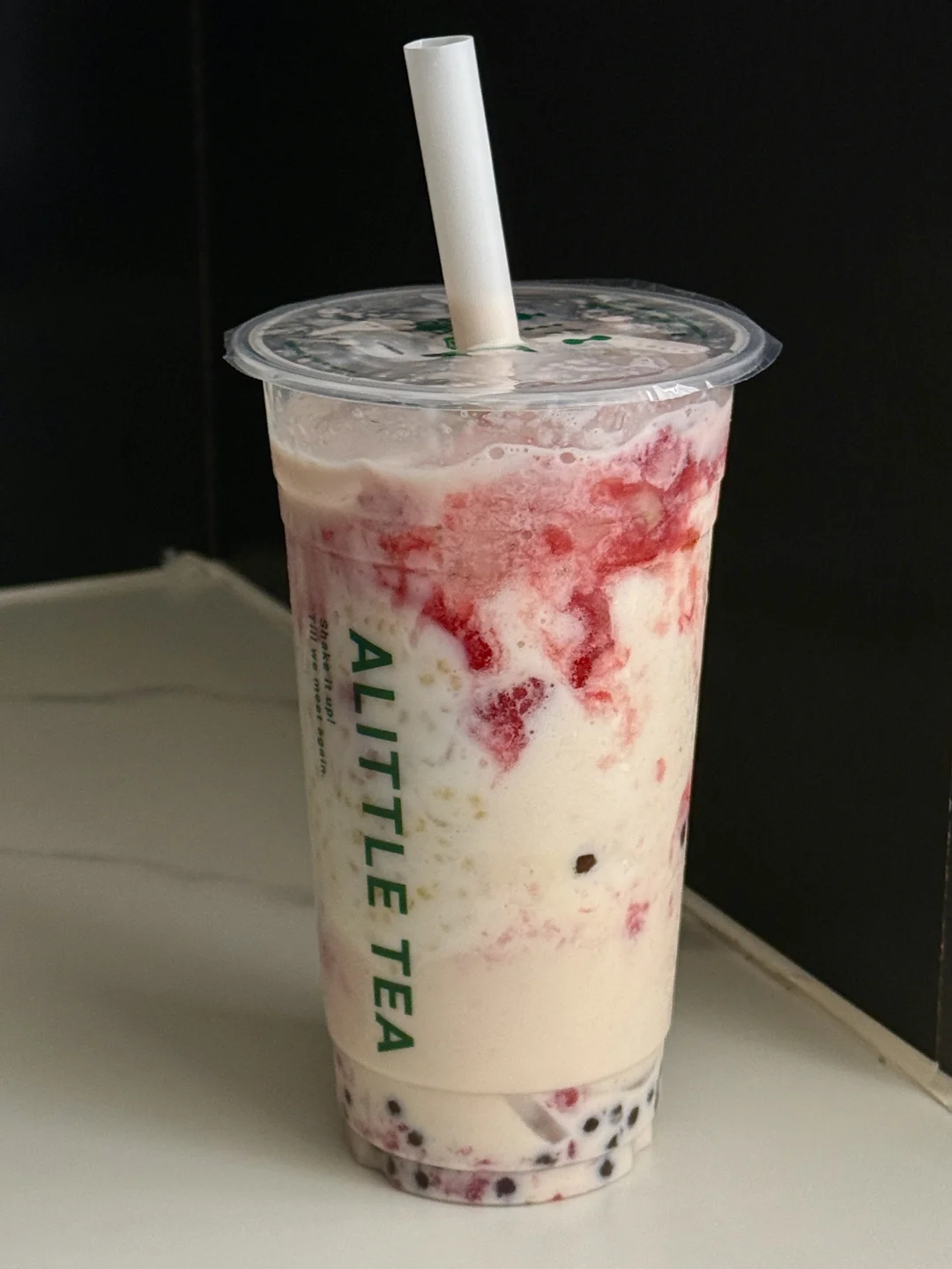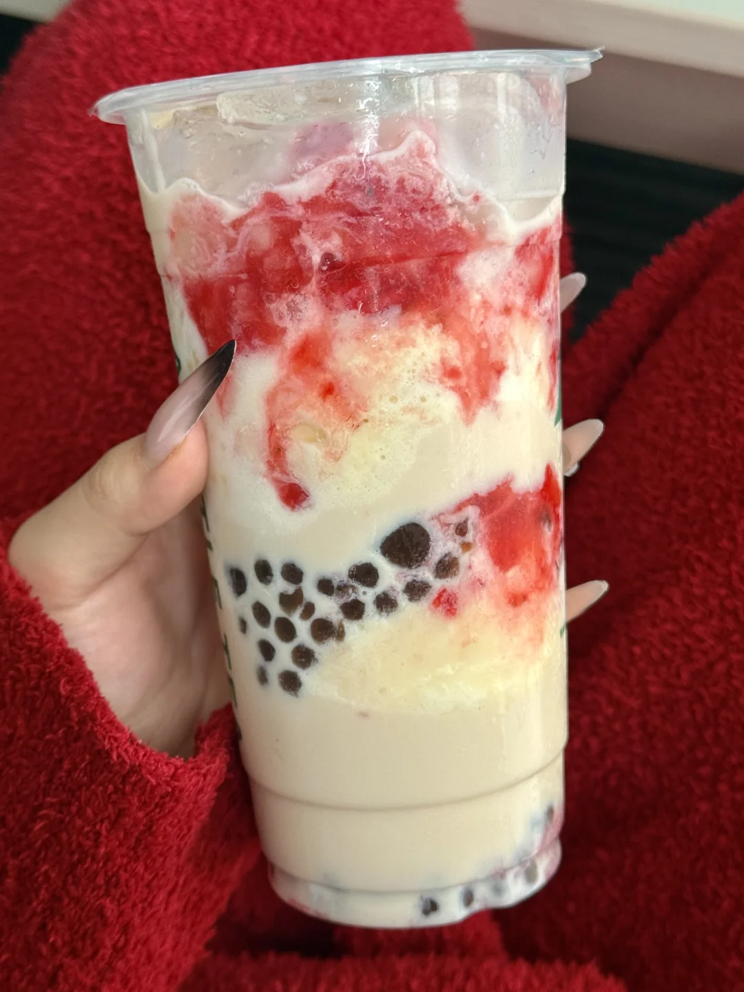 看网友跟风点的!好好喝! 米麻薯草莓奶绿改A2牛乳➕波霸➕珍珠➕椰果➕两颗冰淇淋球,不另外加糖/少冰 又奶又清爽的!!喝不腻!