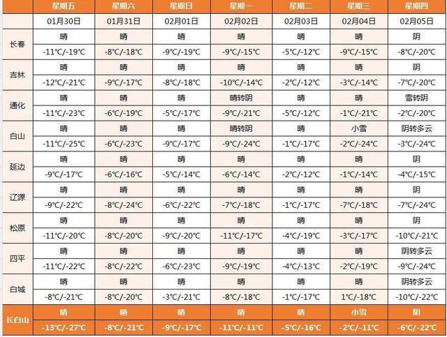 今天午后到明天白天,吉林北部、延边西部、长白山保护开发区多云,有小雪,其他地区晴有时多云。