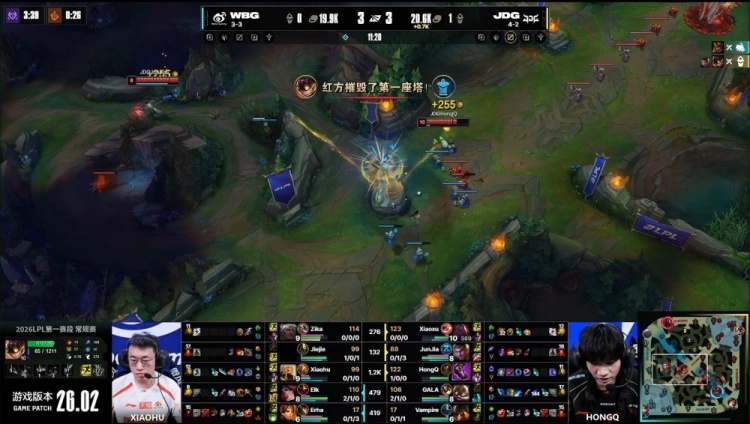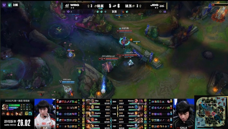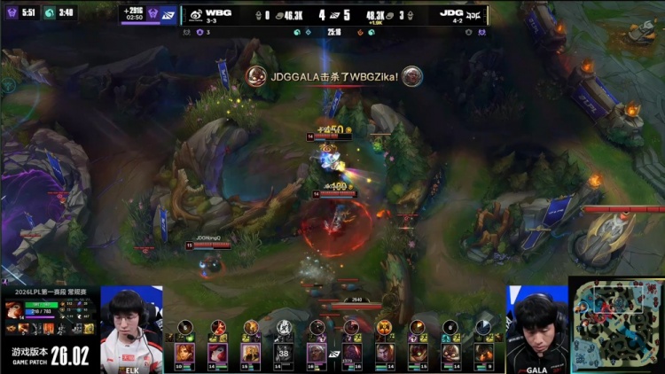 [10:55]GALA下路河道惨遭WBG三人逮捕,Elk女枪拿到人头,双方AD战绩均为2-1-0。HongQ吉格斯炸掉WBG中路一塔,JDG经济领先1.2k。